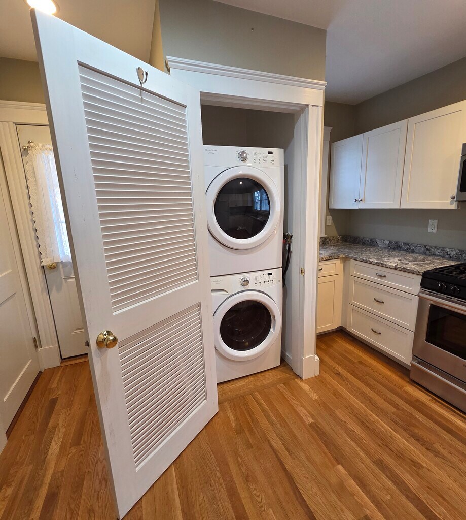 This is a two family, owner-occupied apartment on Pine Street. This first-floor unit features a beautifully renovated kitchen with white cabinetry, granite countertops, stainless steel appliances. HardWood floors throughout. Traditional dining room opens to a spacious living room, complemented by two bedrooms and a fully renovated bath. Also private back porch and shared back yard. InUnit Laundry! 1 Car plus City parking on street! (Small dog negotiable with extra fee)