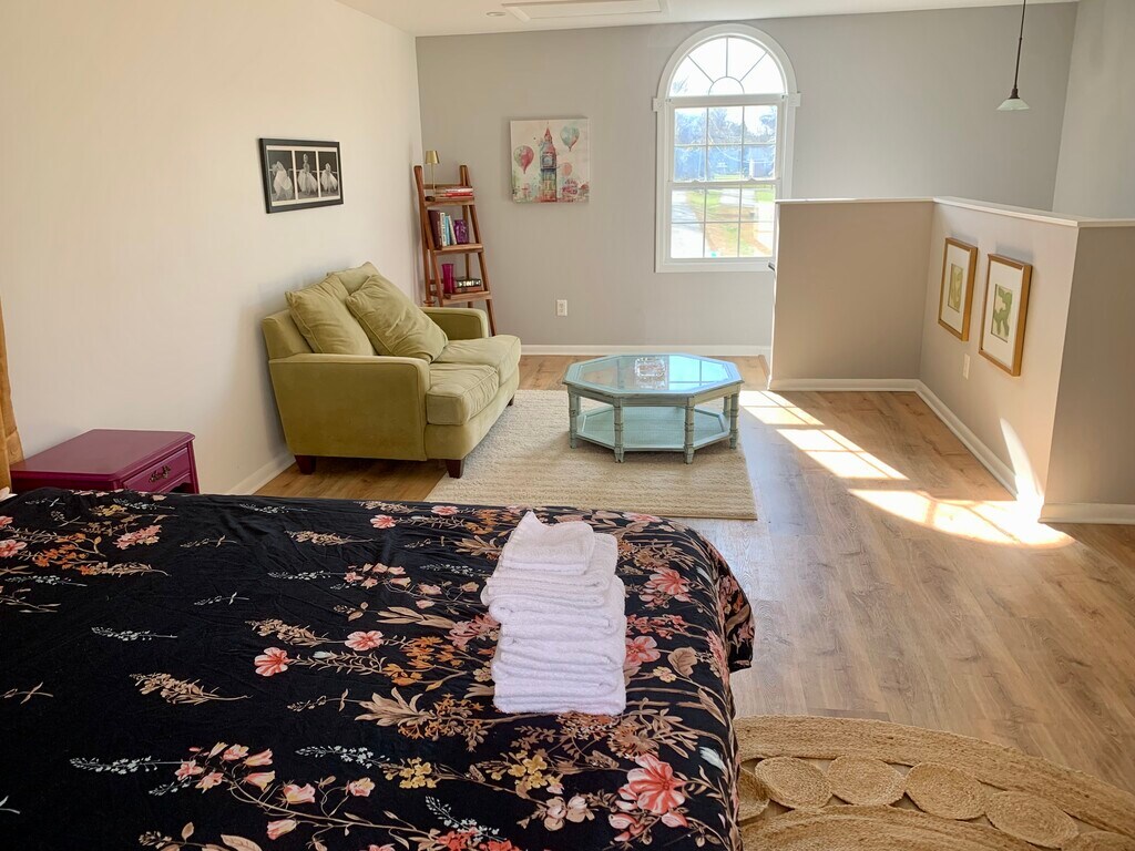 The guesthouse is a private, two-story hideaway is designed with the creative spirit in mind. The first floor opens into a flexible studio space with a kitchenette and full bath, while upstairs is a light-filled loft. Outdoors, the expansive deck overlooks calm waters that shimmer at golden hour, while the private pier offers a front-row seat for fishing, crabbing, or launching kayaks.
