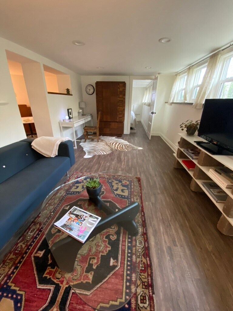 We are located in the heart of the best that Portland has to offer. So much to do locally for an active lifestyle and within reason for a good commute. This is a neighborhood of tree-lined streets and beautiful homes- Our new, extremely private daylight basement apartment is in a historical house designed by a famous turn of the century architect, Joseph Jaccoberger. There is a view of downtown across the river from the apartment bedroom door window. Tenant enjoys views of the side yard (which is yours to enjoy) with four towering aspen trees, wildflowers, figs and grapes! We do not use this part of the property at all. Apartment is double sheet-rocked and has extra sound proofing and the bedroom is triple sound proofed. The apartment has 8 windows, a designer bathroom with a European shower and a restored and hand tiled luxury vintage clawfoot tub. Brand new queen mattress and bedding, armoire and closet. Kitchen has a double burner cooktop, small Cuisinart oven, microwave, coffee maker and hot water kettle. Everything is new. Parking is at the foot of the path under a lantern and we've never had a problem in 7 years. Laundry is shared. Just choose your days.