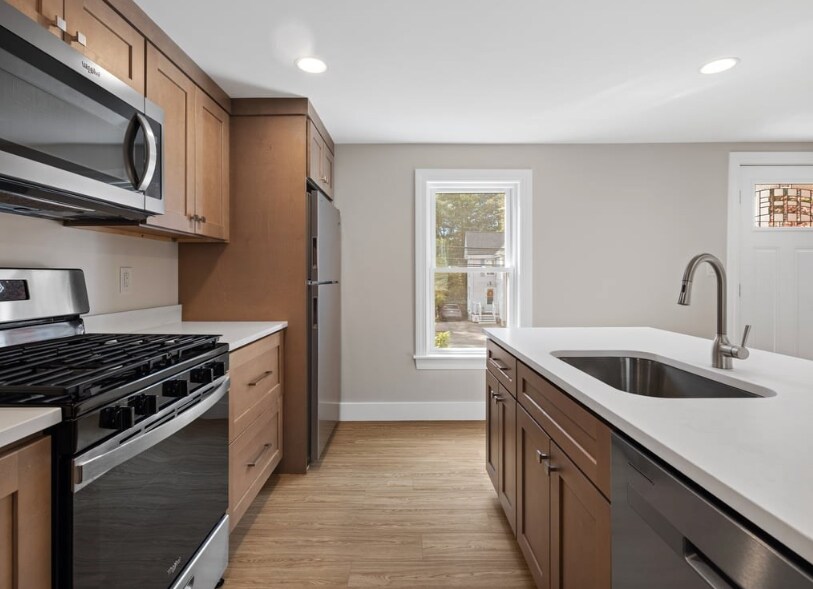 Conveniently situated for easy highway access, shopping, restaurants and top rate schools. This cozy and inviting home has been completely remodeled with high end appliances, reimagined modern kitchen with a custom island. Hardwood floors installed throughout. Gorgeous bathroom with soaking tub creating an oasis like quality. Two good sized bedrooms on the second floor with plenty of natural light. New heating and electrical systems as well as a 3 season porch off of the kitchen creating more space. This classic home has a private driveway for 2 cars, a backyard with space to relax and enjoy fresh air, a storage shed and a front yard space. Gas is included in the monthly rental price. All new windows, central air and heat with multiple zones. Unfinished basement has ample room for storage.