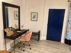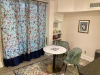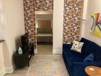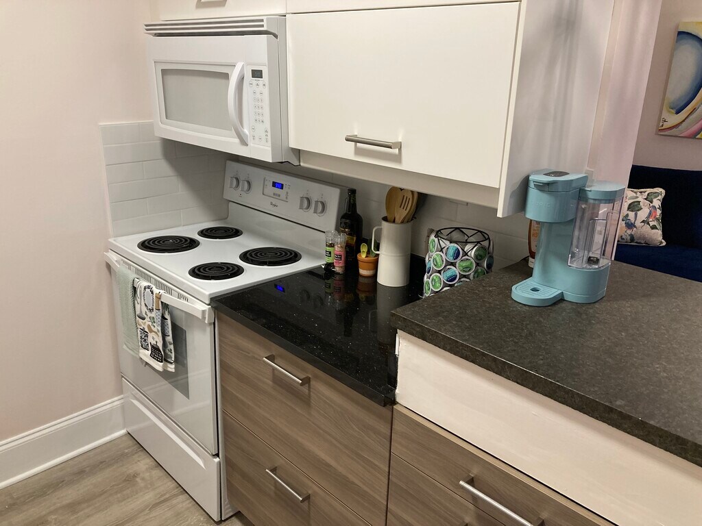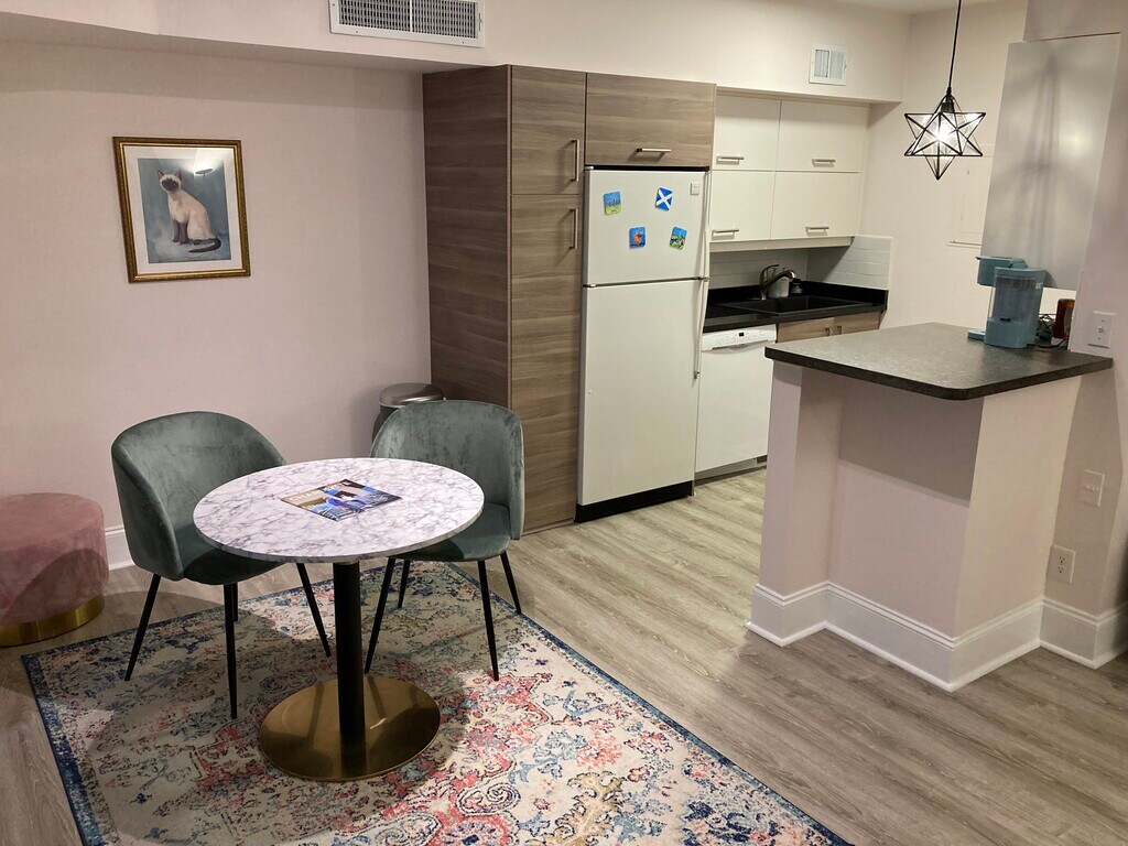 This modern 1-bedroom apartment is located in a serene and well-connected area of Charlotte. The bedroom has a wardrobe for clothes and a storage area to hide away anything else you travel with. The living area has a couch as well as a desk and chair that could be used as a vanity or workspace. The dining area has a table with two chairs and built-in shelving. There is a full kitchen with primary appliances and a small bar area. The covered patio and furniture provides a private outdoor space.