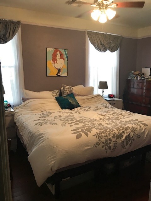 Not a shotgun! Bedroom is off of a hallway. Cute craftsman with built ins and lots of details. High ceilings with ceiling fans. Central heat and air. New replacement windows. Renovated kitchen and bath. Washer, dryer, dishwasher, garbage disposal. Large gated and privacy fenced back yard. Very walkable neighborhood. Bake path to the quarter right out the front door. Off street parking. Cats and dogs ok. Utilities are $200 a month.
