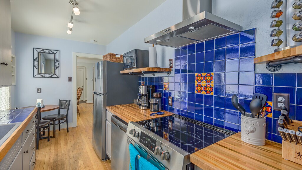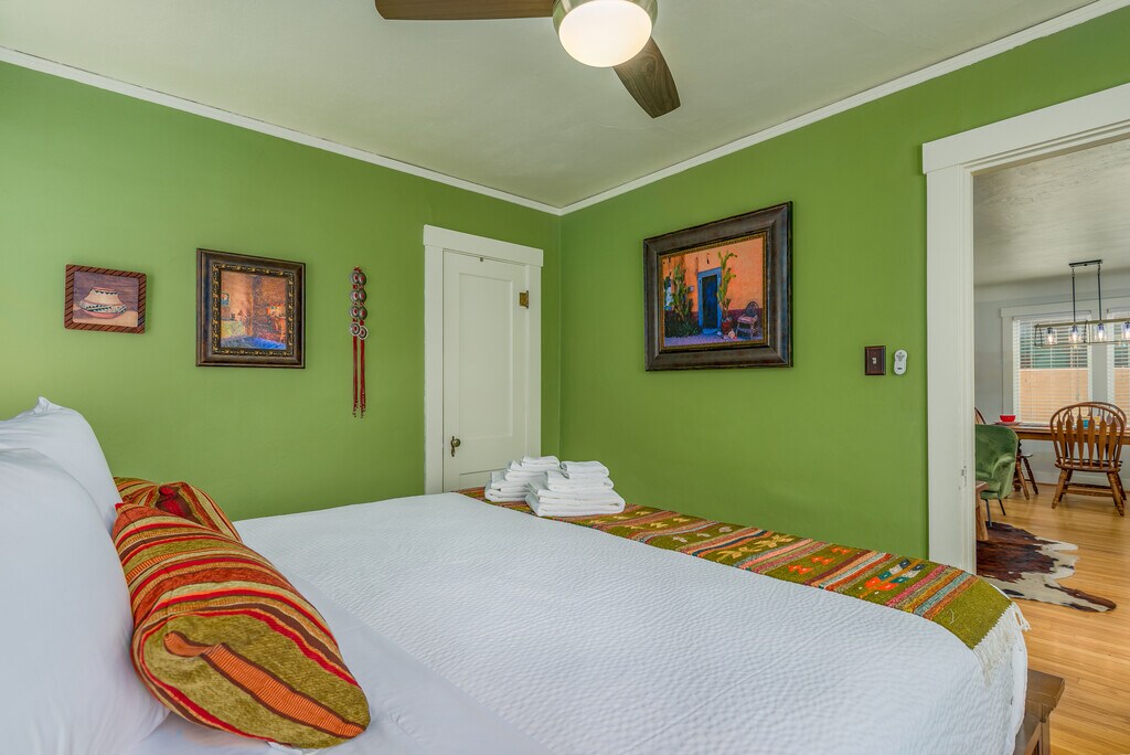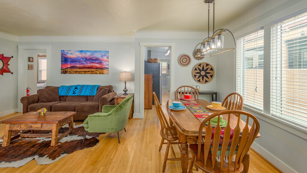 Un alquiler ideal a medio plazo cerca de muchos lugares de trabajo y atracciones populares de la ciudad. Incluye cómodos servicios, plazos de arrendamiento flexibles, un vecindario vibrante con diversas opciones de entretenimiento y fácil acceso al transporte, lo que permite un equilibrio perfecto entre trabajo y placer. Si lo que busca en Albuquerque es comodidad y diversión, ¡no busque más! Bienvenido a... La Jolla, ¡la joya de Nob Hill! Ubicado en el vibrante e histórico distrito de Nob Hill, La Jolla tiene una ubicación ideal para la Universidad de Nuevo México (menos de 1,6 kilómetros/1 milla), el UNM Hospital (3,2 kilómetros/2 millas) el Aeropuerto Internacional Sunport de Albuquerque (6,4 kilómetros/4 millas) y, por supuesto, muchos restaurantes elegantes y tiendas eclécticas a pocos pasos. La Jolla ofrece una muestra del suroeste de Albuquerque. Su decoración incluye alfombras de cuero de vaca, tapices mexicanos y una colorida mezcla de influencia local que lo sumerge en una experiencia única y cálida de Nueva México. La Jolla es una casa de 100 metros cuadrados/1.030 pies cuadrados de dos dormitorios y un baño con su propia entrada privada a un patio privado. La propiedad incluye su propia entrada eléctrica a la propiedad para mayor privacidad. Está equipado con una estación de recarga de coches eléctricos. Después de un día activo, ase sus alimentos favoritos en la parrilla de gas propano en el patio trasero. Disfrutará de pasar el rato bajo las estrellas o las luces de fiesta en verano en el patio. ¿Demasiado frío para pasar el rato al aire libre? Acomódate en la hoguera de propano y disfruta de tu bebida favorita junto al fuego con familiares y amigos. Si prefiere pasar la noche, ¡no hay problema! Encontrará la cocina totalmente equipada con todos los utensilios de cocina, cubiertos y utensilios para hornear para preparar todos sus platos favoritos. También hemos proporcionado una licuadora, una olla, una molinillo de granos de café y una cafetera, por nombrar solo algunos. ¡Nunca hay que preocuparse por las especias caras! Esta propiedad está bien equipada con un carrusel de 20 especias diferentes listas para encender una noche de creatividad culinaria. ¿Hemos mencionado que todos los electrodomésticos de cocina son nuevos? ¡Nada más que lo más nuevo y lo mejor te espera! Su descanso es importante para nosotros. Disfrutará del dormitorio principal cómodo, amplio y elegantemente decorado, que cuenta con una cama King, una cómoda amplia y mucho espacio en el armario. El segundo dormitorio incluye una cama grande, una cómoda y mucho espacio de almacenamiento en el armario. Una tercera habitación se puede utilizar como oficina y otra habitación con una cama doble (inflable) disponible que se puede configurar a solicitud. ¿Necesita espacio para trabajar mientras viaja? ¡No hay problema! La tercera habitación incluye un escritorio grande, monitor, conexión Ethernet e impresora. Le encantará la velocidad de descarga de Internet de 300Mbps. La sala de estar está decorada con un cálido tema del suroeste que incluye asientos para cinco personas. El comedor tiene capacidad para seis personas. Disfrute de su café matutino en la mesa del bistró de la cocina para comenzar el día. ¡Venga a disfrutar de este ambiente del viejo mundo con las amenidades del mundo moderno! ¡Reserve hoy mismo!