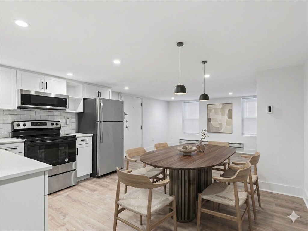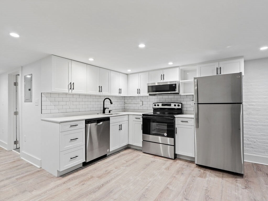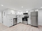 Completely gut-renovated unit featuring a modern open-concept layout with high-end finishes throughout. Bright and spacious living area with recessed lighting and luxury vinyl plank flooring. Stunning kitchen with white shaker cabinets, granite countertops, stainless steel appliances, and subway tile backsplash. Updated bathroom with sleek glass-enclosed tiled shower and contemporary fixtures. Efficient hydronic baseboard heating with digital controls. Clean, minimalist design with great usable space throughout. Convenient location close to shops, restaurants, and public transportation.. Tenant pay for electric; water and sewer included. Private off street parking available not included420