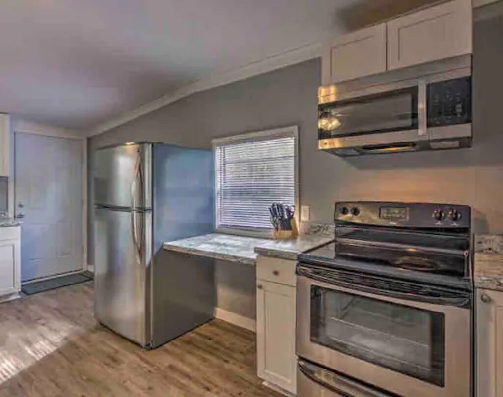 Newly renovated 3-bedroom, 2-bath duplex offering modern comfort and space. The large kitchen features new cabinets, granite countertops, dishwasher, refrigerator, electric range, microwave, and a dedicated dining area. A bright sunroom sits just off the kitchen. Bedrooms are nicely sized, including a primary suite with en suite bath. Second full bath includes a tub/shower combo. Plank tile floors throughout, linen storage, and stackable washer/dryer hookups with an additional storage closet. Enjoy a large fenced backyard and parking for two cars in a circular drive.