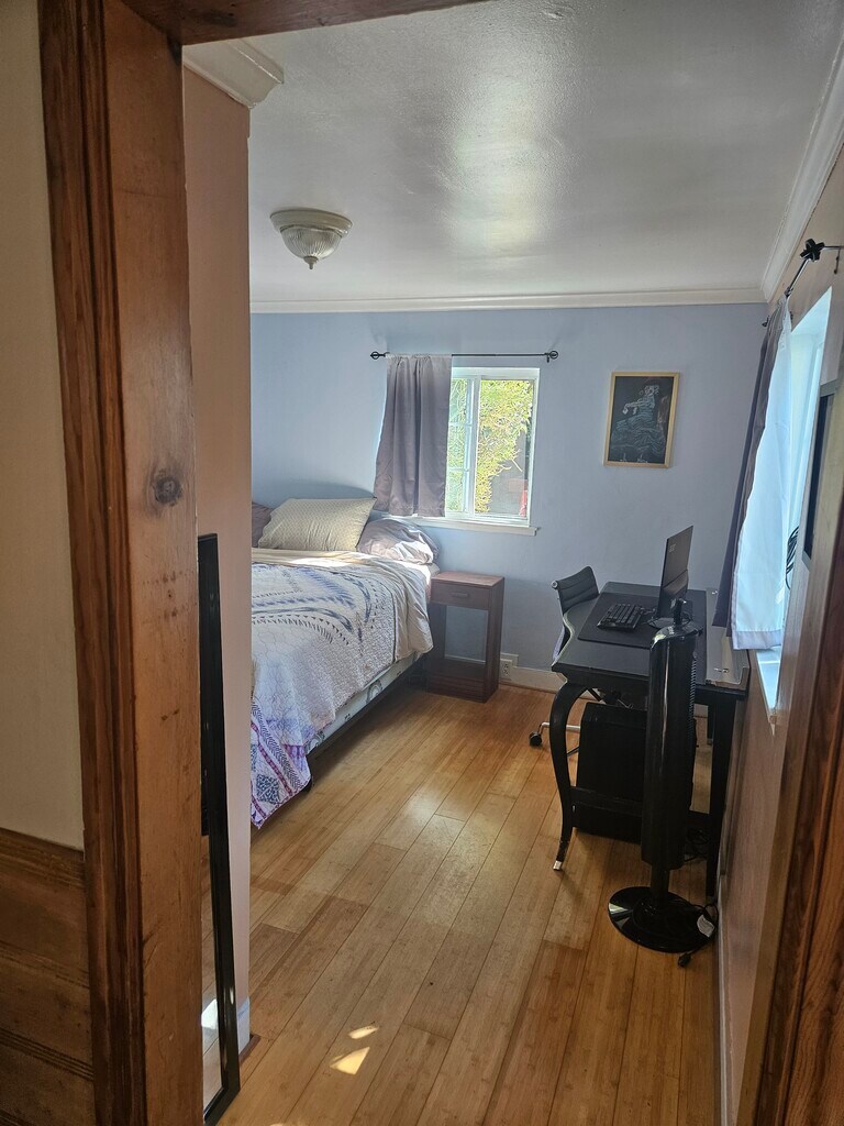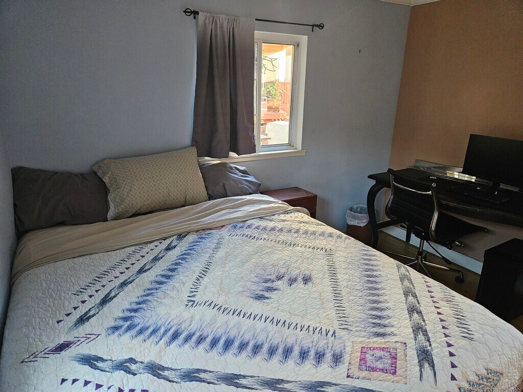 Furnished four-room Mid-Century Cabin with Queen Bedroom adjoining spacious living room with massive fireplace: Utilities, private W/D, and house-cleaning services provided. Bamboo and tiled throughout, vaulted ceilings with skylights and track lighting, stained glass, and custom windows. DirecTV and Roku box. Monitors and printer. 30-day stays or more (rent reduced by $200/month for longer term stays to $4k for year).