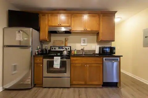 Construido en 2015, este es un sótano privado de un dormitorio con luz natural, ADU, construido en el piso inferior de la casa principal. Con una ubicación céntrica en el interior del noreste de Portland y fácil de caminar, andar en bicicleta o tomar el transporte público a excelentes restaurantes y tiendas. Servicios públicos y WiFi incluidos, cama Queen de espuma viscoelástica, televisor de Apple con Netflix compartido, cocina completa con refrigerador de tamaño estándar, estufa, horno, horno de microondas, tostadora, ollas y sartenes, vajilla y lavaplatos. El baño completo incluye una bañera/ducha, lavadora/secadora apilable y mucho espacio en el mostrador. Estamos a la vuelta de la esquina de varias fantásticas cafeterías, bares y restaurantes, ubicados en la frontera del hermoso barrio de Irvington y Eliot. Estamos cerca de Williams y Mississippi Avenue y tardamos cinco minutos en llegar a pie al Irving Park. Cerca del centro de la ciudad, Alberta Arts y el centro de convenciones. Hay un amplio estacionamiento en la calle, no se requieren permisos. La parada de autobús está a dos minutos a pie.