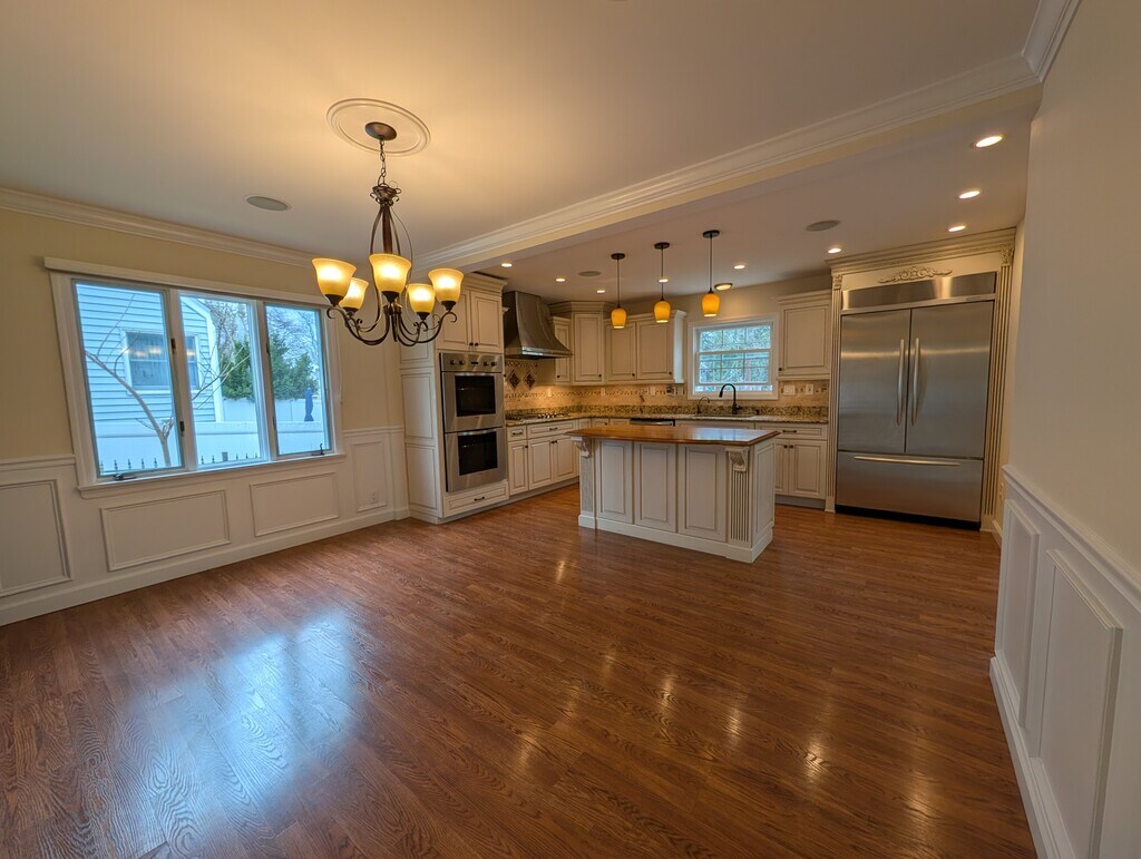 Beautifully renovated entire single-family home in a prime Ridgewood location. Walk to town, restaurants, shopping, and NYC train or bus. Located in a highly sought-after Blue Ribbon school district. The first floor features a brand-new kitchen with stainless steel appliances, walnut center island, and hardwood floors. Also on this level are the primary bedroom, second bedroom, living room, dining room, and a three-season porch perfect for morning coffee. Upstairs is an extra-large room that can be used as a bedroom, office, or multi-zone living space. The fully finished lower level includes a separate entrance, legal cooking area, washer/dryer, large closet space, and attic storage. Off-street parking included. Available immediately. $4,750/month + Gas/Electric/Water. Cats allowed. No dogs. 1.5 months security + first month rent. Credit/background check required ($50 fee). Square footage is approximate and provided for reference only.