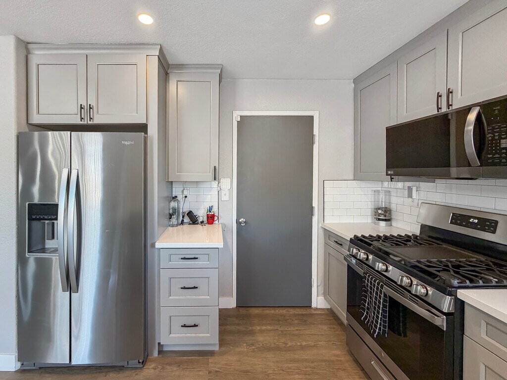 Welcome home to this turnkey 3-bedroom, 2-bath property offering 1,344 sq ft of beautifully updated living space. Recently remodeled, this home is truly move-in ready, just bring your furniture! Enjoy fresh interior paint, new vinyl flooring throughout, updated blinds, and ceiling fans in every bedroom and the living room. The kitchen features recessed lighting, brand-new cabinets, stainless steel appliances, a tile backsplash, quartz countertops, and an oversized island large enough to serve as a kitchen table. The spacious living room includes a cozy gas fireplace and a sliding door that opens to the backyard. The yard features a concrete slab and is a perfect blank canvas to design your dream outdoor space. All bedrooms are generously sized, with the primary bedroom offering a full wall of closet space. Both bathrooms feature walk-in tile showers. Laundry is conveniently located in the garage. The home also includes leased solar, an amazing bonus in our warm climate, helping keep monthly utility bills down. Turnkey, updated, and ready for you to move right in, this one checks all the boxes! Schedule a tour today.