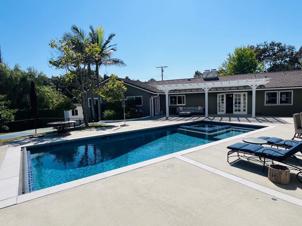 Charming Private 4 Bedroom Home with Pickleball Court in Rolling Hills Estates Located on a spacious cul de sac in the highly desirable Masongate neighborhood, this charming single story family home offers privacy, comfort, and exceptional outdoor amenities. The home features 4 bedrooms and 4 bathrooms, a large kitchen, and an open concept great room ideal for entertaining and family living. Remodeled bathrooms, dual zone air conditioning, and an included washer and dryer provide modern comfort throughout. Step outside to an entertainer's backyard featuring a private pickleball or sports court, a beautifully redone heated swimming pool, and a jacuzzi with Bluetooth capability. A separate pool house bath and outdoor shower provide convenient facilities for guests enjoying the pool and outdoor spaces. The outdoor covered BBQ kitchen makes hosting effortless, while a large storage shed offers plenty of room for bikes, sports equipment, and outdoor gear. Mature fruit trees add charm and privacy to the property. Weekly professional pool and landscaping service are included. Additional features include a 2 car garage, attic storage, and generous parking. Set in a peaceful ranch style neighborhood, the home is within walking distance to local elementary schools, high schools, and preschools, and is just minutes from scenic horse trails, parks, and outdoor recreation. This is a rare opportunity to enjoy space, privacy, and resort style living in one of Rolling Hills Estates most desirable neighborhoods.