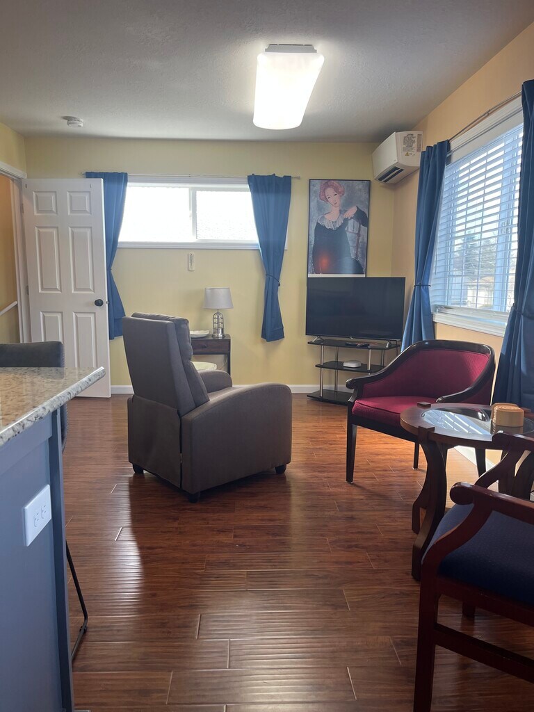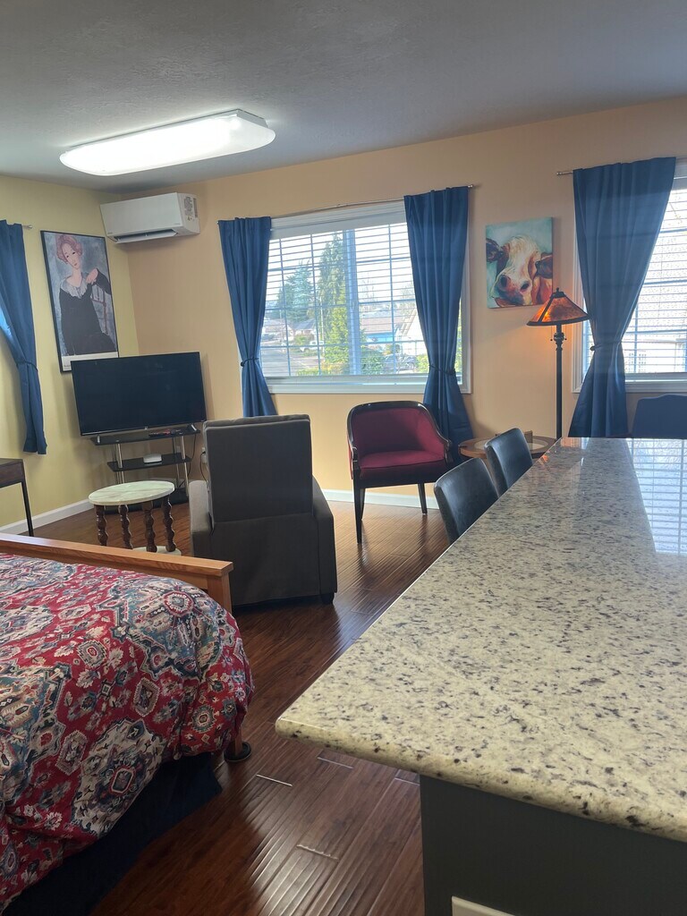 Over the garage furnished studio apartment with homeowner on premises and private entrance behind locked fence. No smoking or vaping and no pets. Sunny with large windows and blackout curtains should you work nights and need darkness during the day. Queen bed with new mattress. Walk in closet with wardrobe storage for clothes and miscellaneous. Fully furnished kitchen with full size appliances and granite countertop island. New coffeemaker, silverware, knives, and has instant hot faucet.