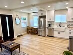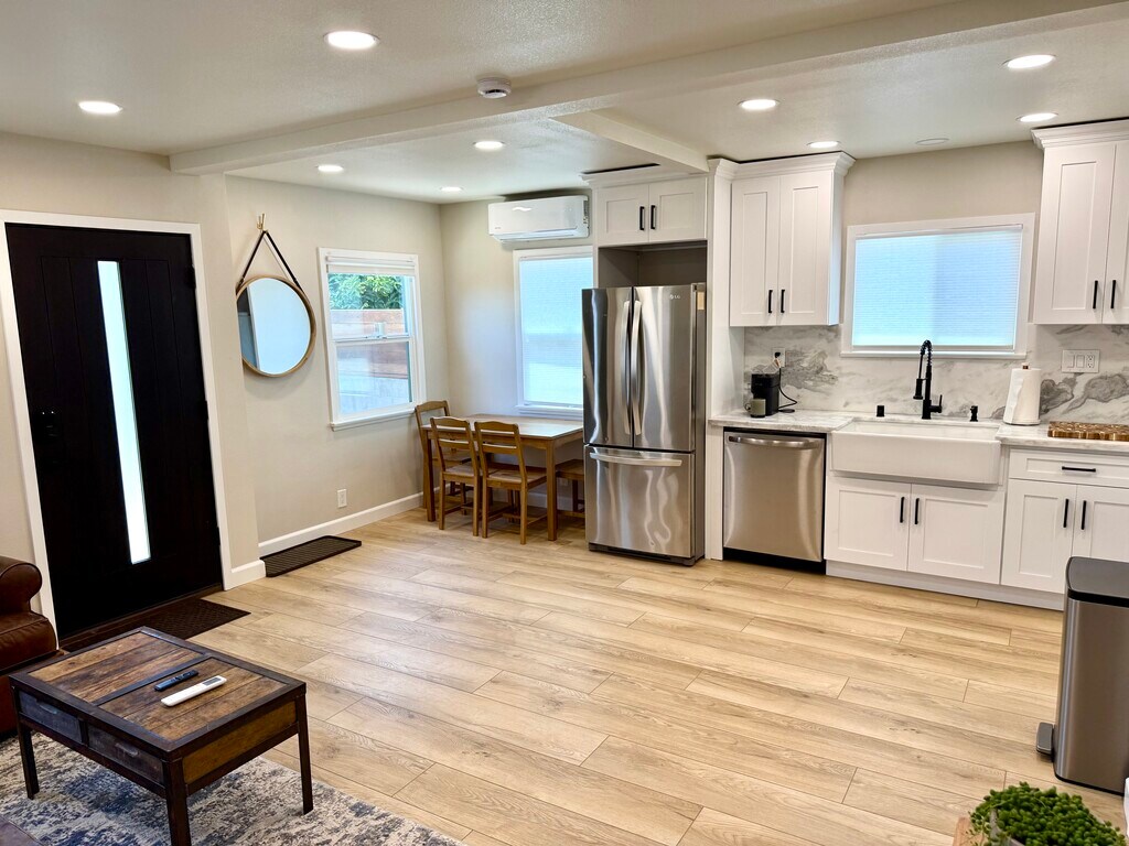 FULLY FURNISHED 1 bedroom, 1 bathroom house with front yard for your dog. Available with or without furniture. This unit was recently completely renovated. Marble countertops, farmhouse sink, marble shower with tub, his/hers duel sinks, 50" wall mounted flatscreen smart tv, heat/AC, queen bed, refrigerator, oven, microwave, dishwasher, leather couch, and fenced front yard. Located one block from the Ballona Creek Bike Path leading to the beach, and just minutes from downtown Culver City with easy access to trendy restaurants, cafes, shopping, entertainment, and major studios.