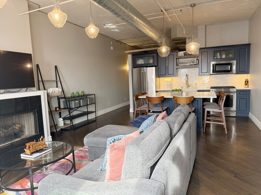 Experience the best of West Loop living in this stunning, top-floor industrial loft. Spanning 850 sq. ft., this residence perfectly balances sleek urban character with high-end, modern designer finishes. Being on the top floor of this mid-rise building ensures maximum privacy, better natural light, and a quiet retreat from the city below with no neighbors above you. Furnishings can be included. The Space: Renovated Kitchen: Massive quartz island (seats 6), farmhouse sink, and under-cabinet lighting. Luxury Appliances: KitchenAid suite including a French-door fridge, oven, dishwasher, and microwave. Living Area: Open-concept with hardwood floors, fireplace, and private balcony. Bedroom: Generous closet space and a bathroom featuring Kohler fixtures. Tech/Utility: ButterflyMX entry system, keyless entry, smart thermostat, central Heat/AC, and in-unit European washer/dryer. Building & Location: The Clinton Complex: doorman, fitness center, dog run, courtyard, bike storage, and private storage cage. Services: Tide Cleaners on-site Commuter's Dream: Steps to the CTA Blue Line, Union Station, and major bus lines. Immediate access to 90/94 and 290. Lifestyle: Easy walk to the Loop and West Loop's world-class dining. The Details: Included: Water and Internet. Tenant Pays: Electricity and Gas. Parking: Secure indoor spot for $175/mo. Pets: 1 cat or dog (up to 20 lbs) allowed with a $150/year pet fee. Move-in Costs: $1,000 refundable security deposit. $300 move-in fee and $500 refundable move-in deposit. One cat or dog (up to 20 lbs) permitted. $150/year pet fee. 1 year lease. Lease includes water and internet. Tenant pays for electricity and gas.
