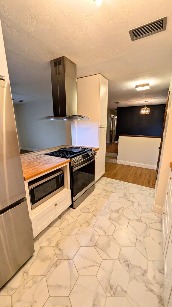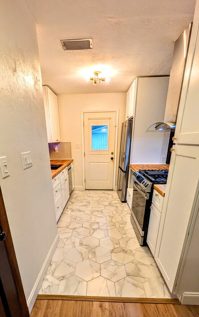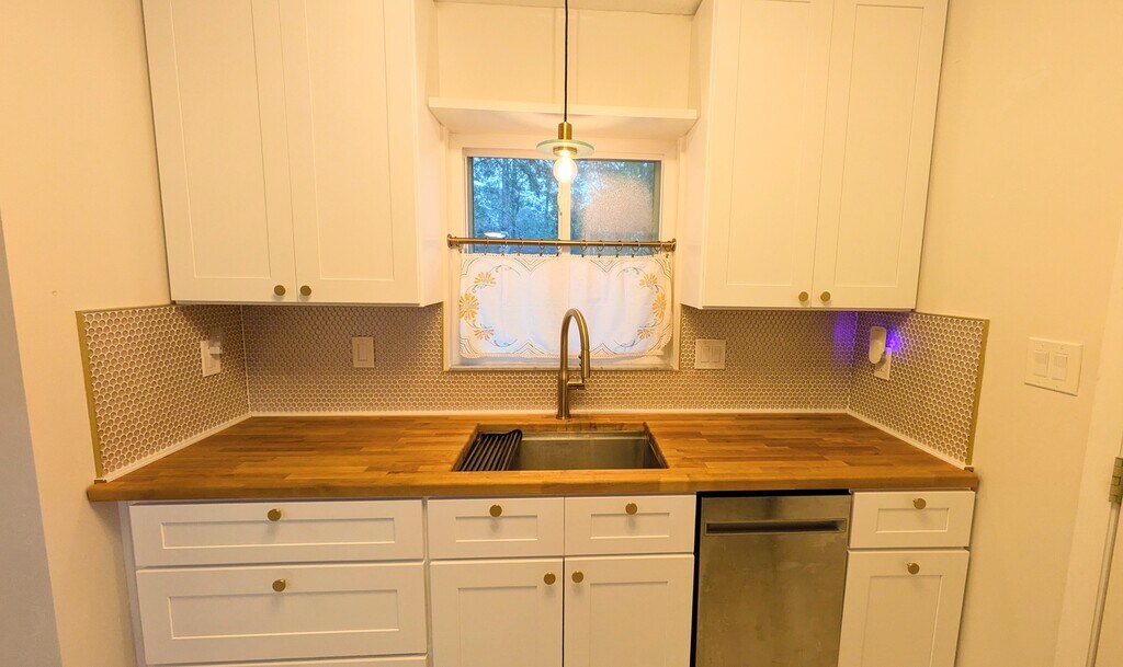 Welcome to 5014 NW 29th St, Gainesville, FL a charming 2-bedroom, 2-bathroom home in the peaceful Northwood area. This property combines modern amenities with a quiet neighborhood vibe. The open floor plan features a living room with custom shelving and a cozy brick fireplace. The kitchen, renovated in 2021, boasts butcher block countertops, a gas stove with an air fryer function, stainless steel appliances, a dishwasher, a garbage disposal, soft-close cabinets, and fully extendable drawers. The master bedroom includes a walk-in closet and an en-suite bathroom. Large sliding glass doors in the living room and master bedroom lead to a new supersize concrete deck. The large fenced-in backyard offers plenty of space. Lawn care is provided! The home includes a washer and dryer, a single carport, and Luxury Vinyl Plank (LVP) flooring throughout. Gas heating and a new 2025 metal roof help lower utility bills. Utilities and internet are the tenant's responsibility. Located near the YMCA, shopping centers, and parks, this home offers a tranquil living environment. Schedule your viewing today and make 5014 NW 29th St your new address! NOTE: Property is currently tenant occupied. Please do not disturb the tenant. Comes unfurnished. The shown floorplan is for illustrative purposes only and is not to scale. All dimensions and layouts are approximate.