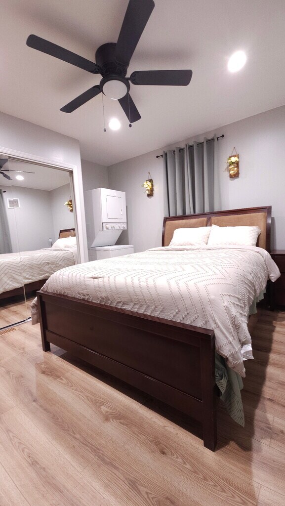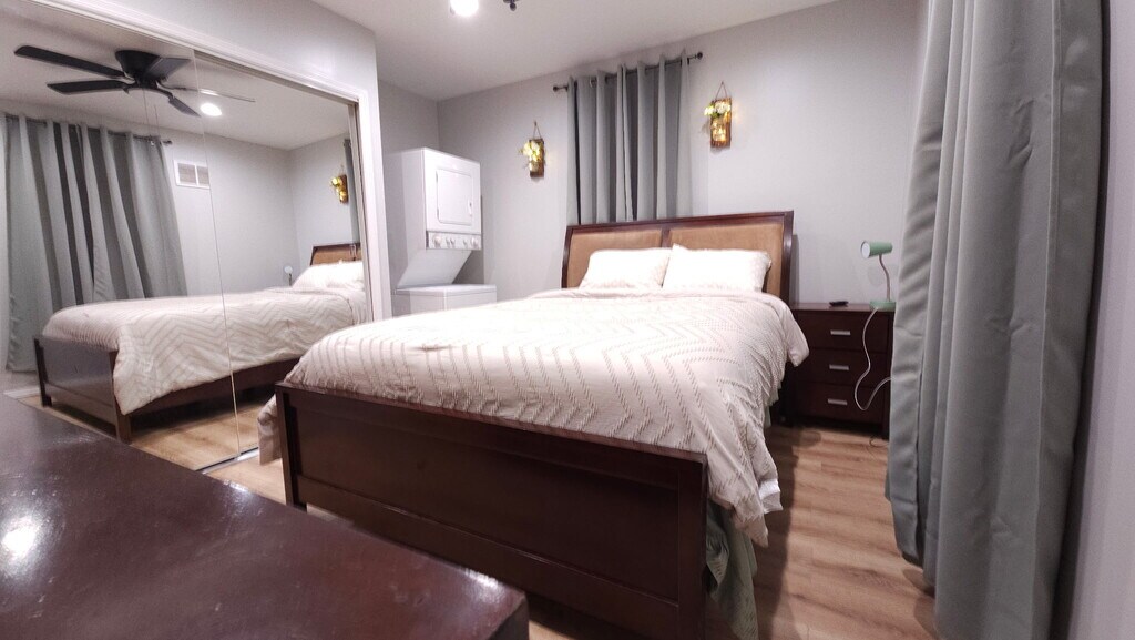 A cozy and comfortable one-bedroom apartment with a full kitchen, bathroom, spacious closets, and washer and dryer included in the unit. All utilities and private parking spot are included in the rent. The unit is fully furnished and stocked with supplies, including bedding, towels, vacuum and mop, kitchen appliances, and cleaning supplies. Central air and heating with independent thermostat in unit. Washer/dryer combo in bedroom for easy washing at any time.