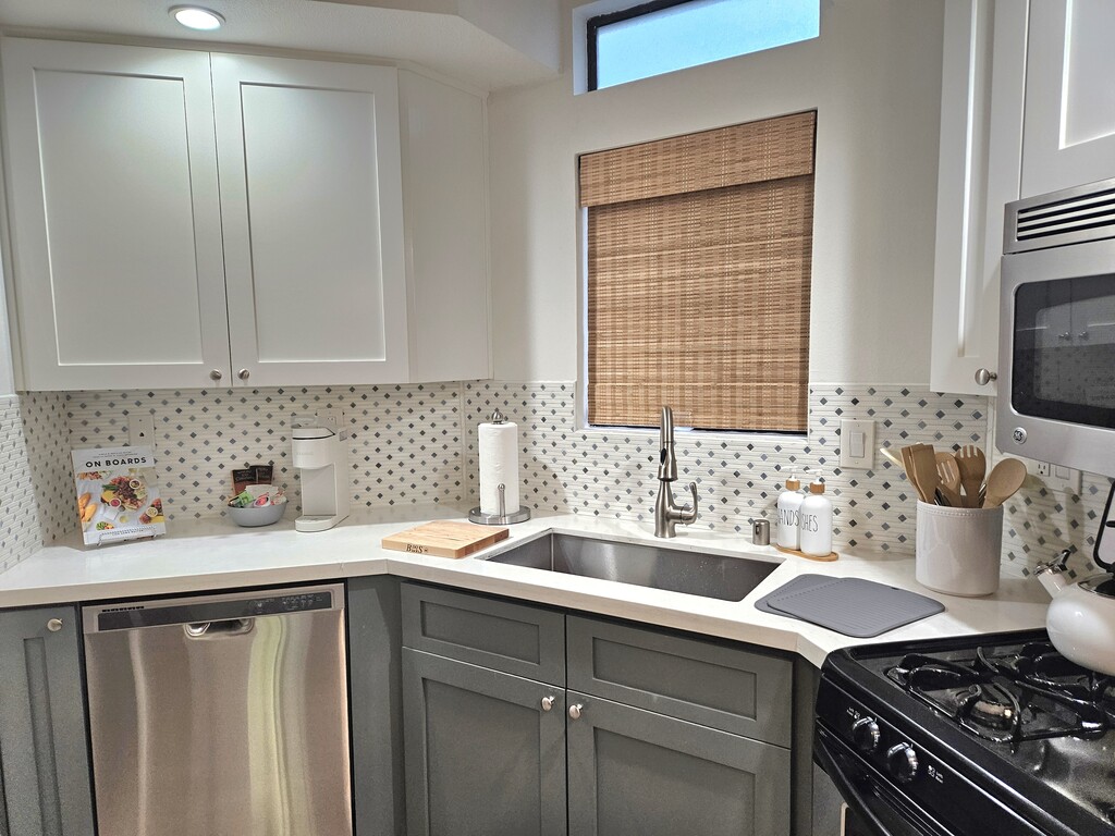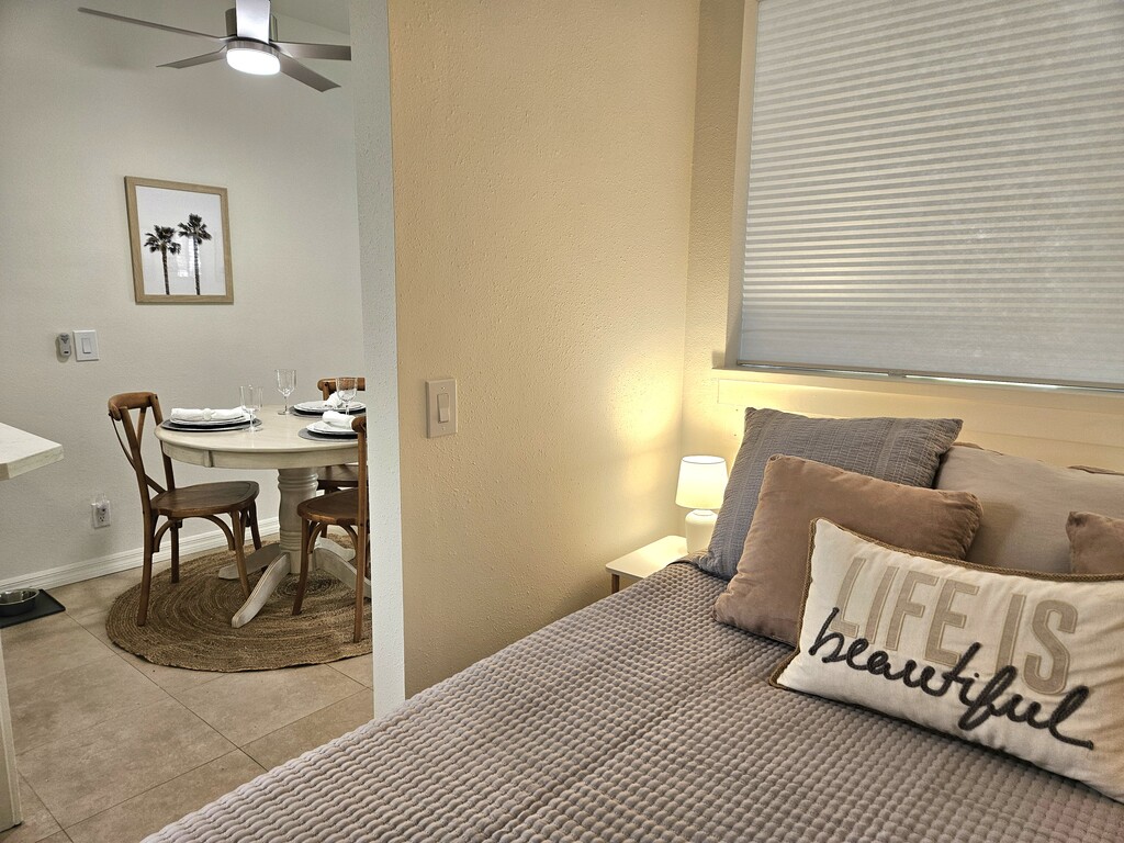 This studio space is roomy and comfortable enough for 2 guests. Located up one small flight of stairs this unit is on the bottom level with designated parking directly underneath. This is a studio with the spaces separated for privacy and each space has its own tv. One Queen sized bed. The dining table seats three and there are plenty of dishes and cooking essentials to make full sized meals in your very own kitchen. The beachy theme lures you into the laid back HB vibes. Make yourself at home in this private end unit and enjoy all the area has to offer. Please note unit has 1 Queen sized bed and 1 Twin sized memory foam rollaway bed.