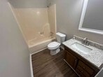 3 Bedroom, 1.5 Bath remodeled House with central air and heat, LVP flooring, large privacy fenced backyard with storage shed, laundry room, granite kitchen and bathroom countertops, and garage.