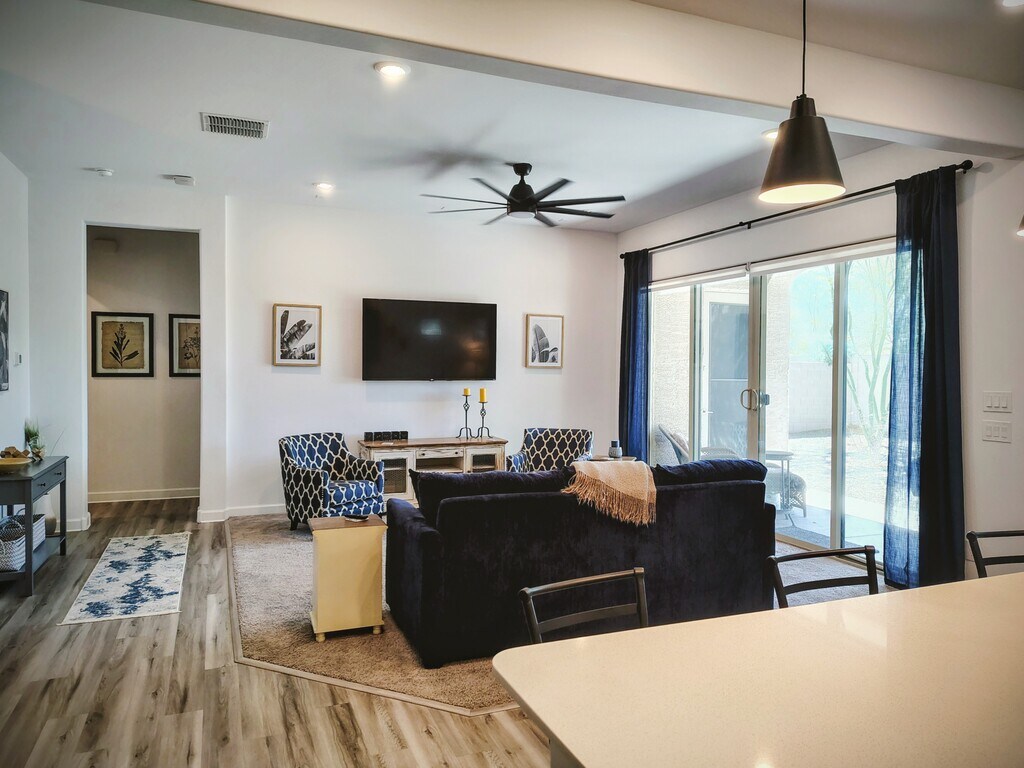 Fully furnished 3 bedroom/2 bathroom open floor plan with 10' ceilings in Blue Horizon neighborhood just off Jackrabbit Trail. This home sits in a cul-de-sac and is an excellent spot to lay your head while exploring the area or when building your dream home! The home is equipped with all you need... just bring your bags! There are plenty of dark espresso cabinets, white quartz counters, gourmet kitchen with stainless steel appliances, and an attached 3-stall garage (2 tandem) with room for more on the driveway. You'll find comfortable bedding, linens and bathrooms supplies to meet your needs. The kitchen has pots, pans, dishes, utensils, a coffee pot and even an Instapot for quick dinners. The patio has a small grill and some comfortable outdoor seating to enjoy the warm evenings. Very easy 30 minute commute to PHX. An added $400 monthly utility fee will pay for all utilities including internet. A small dog can be considered with an additional $300 nonrefundable pet deposit. No smoking allowed inside home. This home also has an attached 1 bedroom unit that has it's own entrance and is rented out separately (this space is completely separated from the main home). If you prefer working with private owners that value relationships with their tenants, this is your property!