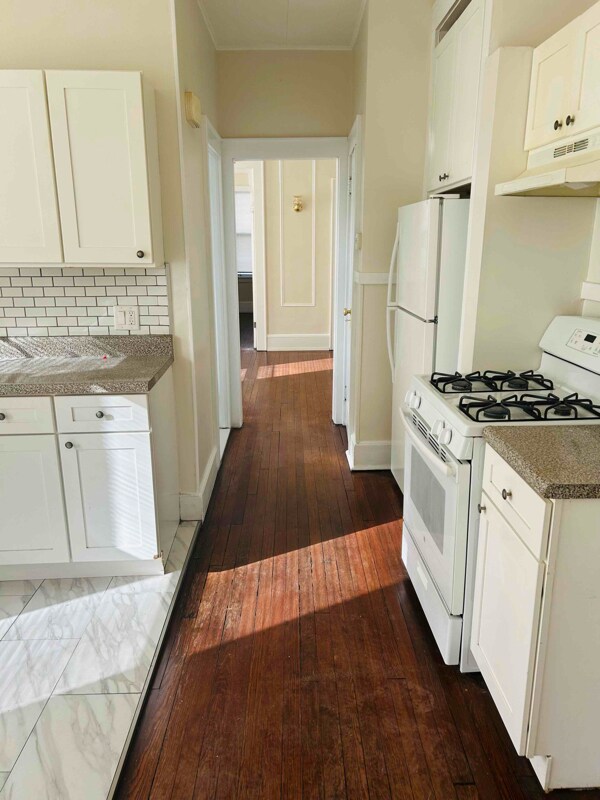 Updated two bedroom, one bathroom apartment with gorgeous hardwood floors and eat in kitchen. The rent includes a detached garage for one car, and an additional parking space for a second vehicle. Within walking distance of train station and shopping. Section 8 Vouchers Accepted. First month's Rent, one month's security deposit required. Laundry on premises