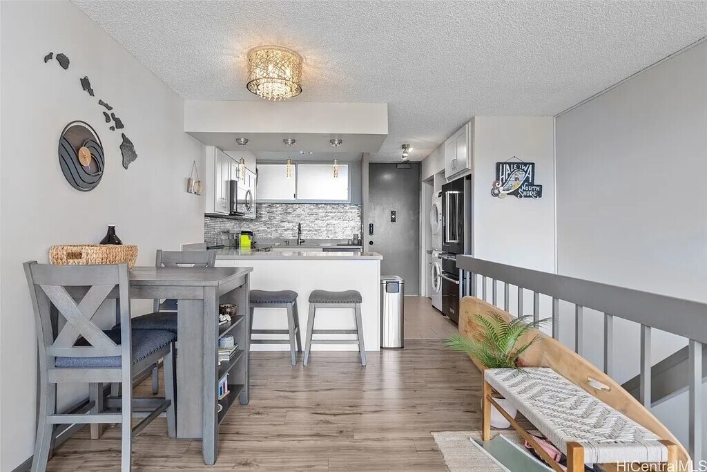 Experience the ultimate comfort in a newly renovated and FULLY FURNISHED split-level home featuring lanais on both levels, offering breathtaking views of Diamond Head that span from the lush mountains to the vibrant cityscape. The thoughtfully designed floor plan boasts a spacious living room and kitchen on the main entry level, with the bedroom located on the lower level for added privacy. Recent renovations include luxurious LVP flooring, a fully modernized kitchen complete with a dishwasher, range, refrigerator, quartz countertops, and in-unit washer and dryer. The sleek bathroom and updated plumbing fixtures throughout (including kitchen, bath, shower, toilet, and shutoff valves) ensure modern convenience, complemented by an upgraded electrical panel and custom closet shelving. Ala Wai Skyrise is a secure, well-maintained building that offers amenities such as guest parking, a pool, BBQ area, and an on-site manager. Perfectly positioned near the bus line, University of Hawaii, Iolani School, and other educational institutions, it provides unmatched convenience. Don't miss this opportunity for an incredible updated unit right in the heart of the city.