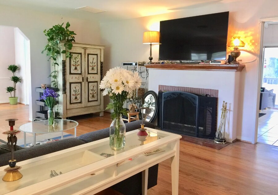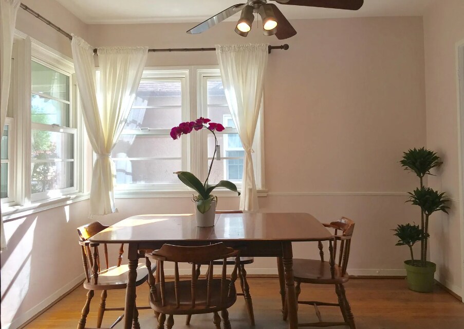 A simple and charming home in a bustling city. 2 bedroom/1 bathroom house is located in a quiet tree lined street in North Hollywood. With 1,390 square feet, it contains very spacious rooms and a lot to offer. The property has a pool (weekly pool cleaning/treatment service paid for by owner) and plenty of room to entertain. There's a spacious backyard (completely fenced in and safe for dogs & monthly yard service paid for by owner), as well as a covered/screened-in patio overlooking the backyard and pool. The house features a new high-efficiency washer and dryer, hardwood floors throughout, a sunlight-filled dining room, a large living room, and a large den/family room. The bathroom was recently remodeled and features a marble floor, a large soaking tub, and a standalone shower with dual-nozzles. Each bedroom has double-closets, built-in storage, and multiple windows. The kitchen has a double-sink, refrigerator, dishwasher, stove and microwave. Additionally, there is a garage which the tenant will be able to use for storage. The home has central A/C and heat, is cable and wifi-ready, and features electrical outlets that are convenient for charging electric vehicles. This home is perfect for year-round entertaining or peaceful solitude. There's a large driveway that can comfortably fit multiple cars, and there are no restrictions (outside of once-a-week street cleaning) on the ample street parking out front. The neighborhood is safe, family-friendly, and beautiful to walk around. It's a 2-minute walk to In-N-Out, and a 15-minute walk to the North Hollywood Metro Red Line station and all of the attractions of the NoHo Arts District (restaurants, bars, movie theater, gyms, comedy theatres, etc). Owner pays for bi-weekly gardener and weekly pool cleaning and maintenance. Tenant pays all other utilities