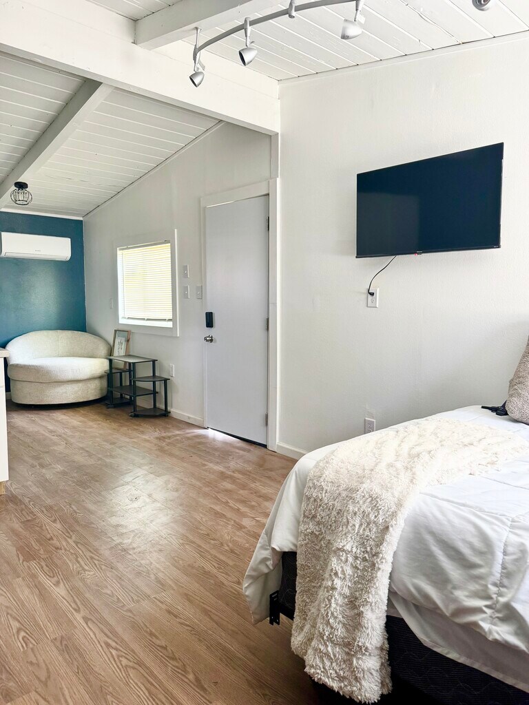 Beautifully maintained studio with a light and airy feel, highlighted by vaulted ceilings, exposed beams, and stylish modern lighting. Features include updated flooring, a cozy living/sleeping space, and a convenient dining area. A clean, well-kept unit ideal for a tenant seeking a peaceful environment. Serious inquiries only. No parties, no pets, and no smoking—strictly enforced.
