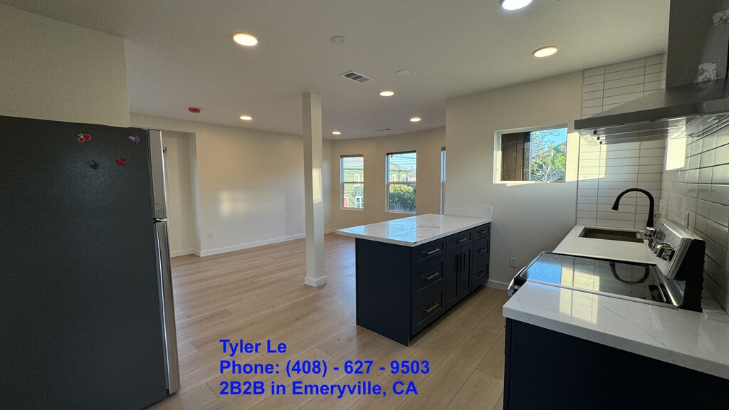 1100 ft2 - Brand New 2 Bedrooms, 2 Bathrooms in the heart of Emeryville, CA. Located just 15 minutes from UC Berkeley, this stylish and contemporary unit is perfect for those seeking comfort, convenience, and modern living. Walking distance to Berkeley Bowl, Public Market, and Berkeley Aquatic Park, this apartment offers easy access to transportation and local amenities. Unit Features: * 2 Spacious brand new bedrooms with ample closet space and large windows for natural light * 2 Private Entrances * 2 Modern brand new bathrooms with high-end fixtures, including a frameless shower, fixed glass panel, and sleek finishes * 9 ft. ceilings throughout * Modern kitchen with brand new appliances and quartz countertops * European-style cabinetry, including navy blue cabinets with gold accents, and ample counter space * New vinyl plank flooring * Private balcony or patio for outdoor relaxation * Large windows throughout the unit, offering fresh air and brightness * Stylish, modern interior design with ample natural light * New air conditioning system with mini-split for reduced electrical bills * Secure and quiet building with controlled access * Windows with automatic roll-up and down blinds Amenities: * Brand new stainless steel appliances: Dishwasher, Self-Cleaning Electric Range/Oven, Refrigerator * Private Washer, Dryer * Spacious 4000 sqft backyard with outdoor dining tables * High-end adjustable table for your workspace Transportation and Community: * Walker's Paradise (Walking Score: 94) – Daily errands do not require a car * Emery Go-Round (Free) shuttle is just a short walk away, providing access to Bay Street, Emeryville, and Berkeley * Easy bus connection to BART for fast travel to Berkeley, Oakland, San Francisco, and beyond * Amtrak Emeryville Station nearby for trips across California * Nearby attractions: Bay Street shopping and dining, Doyle Hollis Park, and Emeryville's vibrant arts scene Nearby Hospitals: * Stanford Health Care, Emeryville (~3 minutes) * Alta Bates Summit Medical Center, Oakland (~5 minutes) * Children’s Hospital Oakland (~5 minutes) * Kaiser Permanente Berkeley Medical Offices (~6 minutes) * Kaiser Permanente Oakland Medical Center (~12 minutes) * Highland Hospital, Oakland (~15 minutes) Lease Terms: * 12-month lease * No smoking