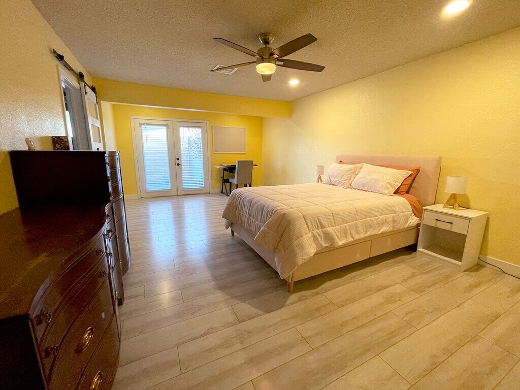 Roomy ranch-style mid-century house in the heart of Las Vegas can be your home away from home. Located in a cozy "Old Vegas" neighborhood, you'll have walkable access to the Medical District, shopping, and miles of hiking at the Springs Preserve just a block away. Three large bedrooms each include an en suite bathroom, and a fourth bedroom is adjacent to a hall bathroom with two sinks and large walk-in shower. Two separate living rooms include flatscreen TVs and lots of seating. A modern kitchen has stainless steel appliances, a center island for meal prep or serving, built-in bar, and walk-in pantry. Enjoy a sunset view of Red Rock from a covered backyard patio with fire pit and barbecue, or socialize with friends on a cozy side garden patio. Master bedroom includes walk-in closet, en suite bathroom w/ shower and soaking tub, and exterior door for independent access. Spacious secondary master includes en suite bathroom w/ shower, and door to garden patio. Third spacious bedroom includes office area and en suite bathroom w/ shower. Fourth "bonus" room includes large closet, flatscreen TV and space for exercising or relaxing. Two large living rooms include flatscreen TVs and lots of seating. Kitchen area has modern appliances and center island.