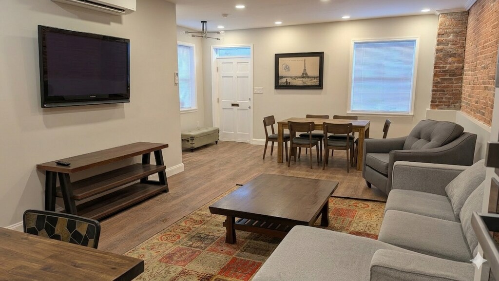 ! This is a shared environment ! Large room, full of light and windows, with en-suite private bath. Fully furnished main floor, including large screen TV and much more! Be the first to enjoy this thoroughly renovated SHARED 4 bedrooms town home in the quiet and safe Ridgley's Delight neighborhood. This home offers a large common area with high-end kitchen appliances, island, big living room and a large basement with washer and dryer and ample storage space. The home is an end-unit, with many windows and plenty of sun light. EVERYTHING is new - plumbing, electric, AC, Appliances, showers and vanities - everything! There are 2 bedrooms on each floor, and every bedroom has a private in-suite bathroom that includes a shower, vanity and a toilet. The rooms are large, well-lit and offer maximum privacy. Each room has a separate AC control heat and cooling system for ultimate comfort. Free high speed WiFi, tenant pays electric and water bills. Minutes walk to UMBC, the UMBC Hospital UMMC and the stadiums. This home is direct neighbor of the Babe Ruth Museum.