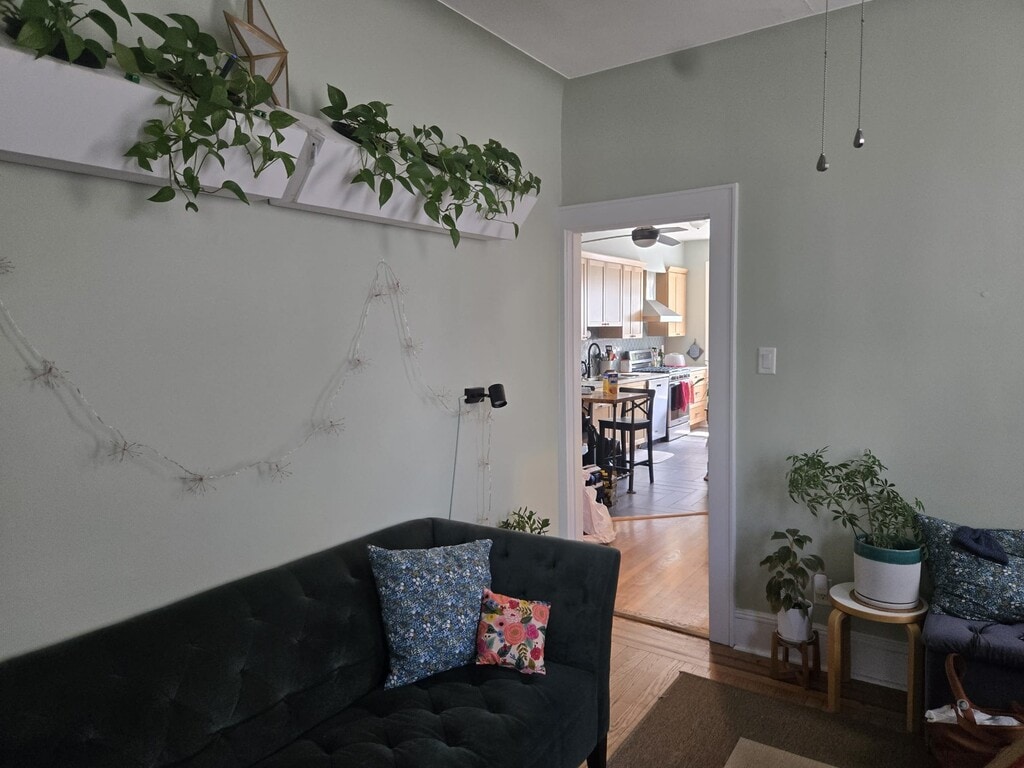 2nd floor apt with 1 main bedroom and second bedroom/office. If you are interested in our apartment please included in your response all the following information: name, DOB, phone number, email, and a paragraph about yourself. Parking space on property behind building included in rent. Hardwood floors, newly renovated custom kitchen with heated tile floor and range hood. Ceiling fans in every room and large windows. Crown molding in bedroom. Multiple large closets in apt and storage closet and cabinet on landing included. Hot water radiator heat and window units for air conditioning (not included). ' Less than one block to Blvd East and buses to NY. 12 month lease. Security deposit is equal to one month's rent.