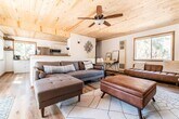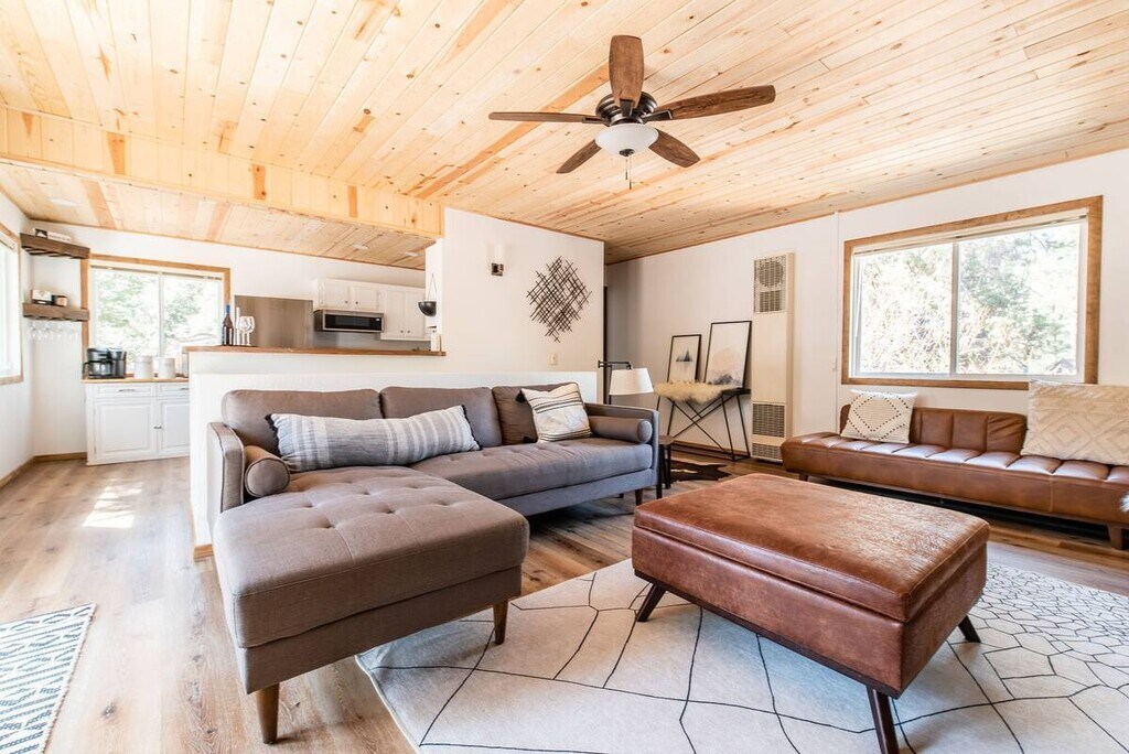 2 BR / 2 BA quiet retreat ideally located near the National Forest and everything Big Bear has to offer. This newly renovated mid-century modern cabin features a private primary suite, an open-concept kitchen, and a cozy, fully functioning fireplace. Enjoy a large, fully fenced backyard with room to run and play, plus a covered patio perfect for outdoor relaxation. The home includes a laundry area conveniently located in the bathroom, ample parking, and a separate storage shed. Offered fully furnished, with an EV charger hookup already in place—move-in ready. Mountain living at its best! Flexible on rental duration.