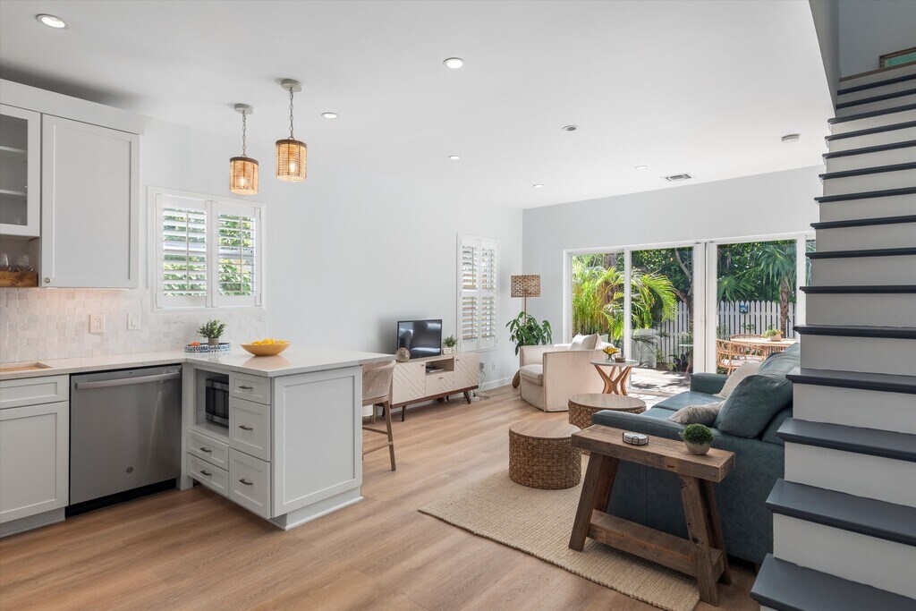 Newly Renovated Townhome in Prime Old Town Key West located just 3 blocks from the beach! Experience the best of island living in this beautifully renovated 2-bedroom, 1.5-bath end-unit townhouse, perfectly situated in one of Key West's most sought-after neighborhoods. Features include a stunning new kitchen with quartz countertops, custom cabinetry, stainless steel appliances, and a handcrafted Moroccan Zellige tile backsplash. The open-concept layout offers bright and welcoming living and dining spaces that extend effortlessly to a private deck - ideal for outdoor dining, entertaining, or quiet relaxation. Upstairs, two spacious bedrooms and a fully renovated bath provide comfort and style, while a convenient half bath serves the main floor. Ideally located off the quiet end of Duval so you have easy access to island's best dining and beaches without the nosy crowds. Bedding: King in the first bedroom , Queen in the 2nd bedroom and a Queen Sleeper sofa in the living room. all utilities and high speed internet are included.