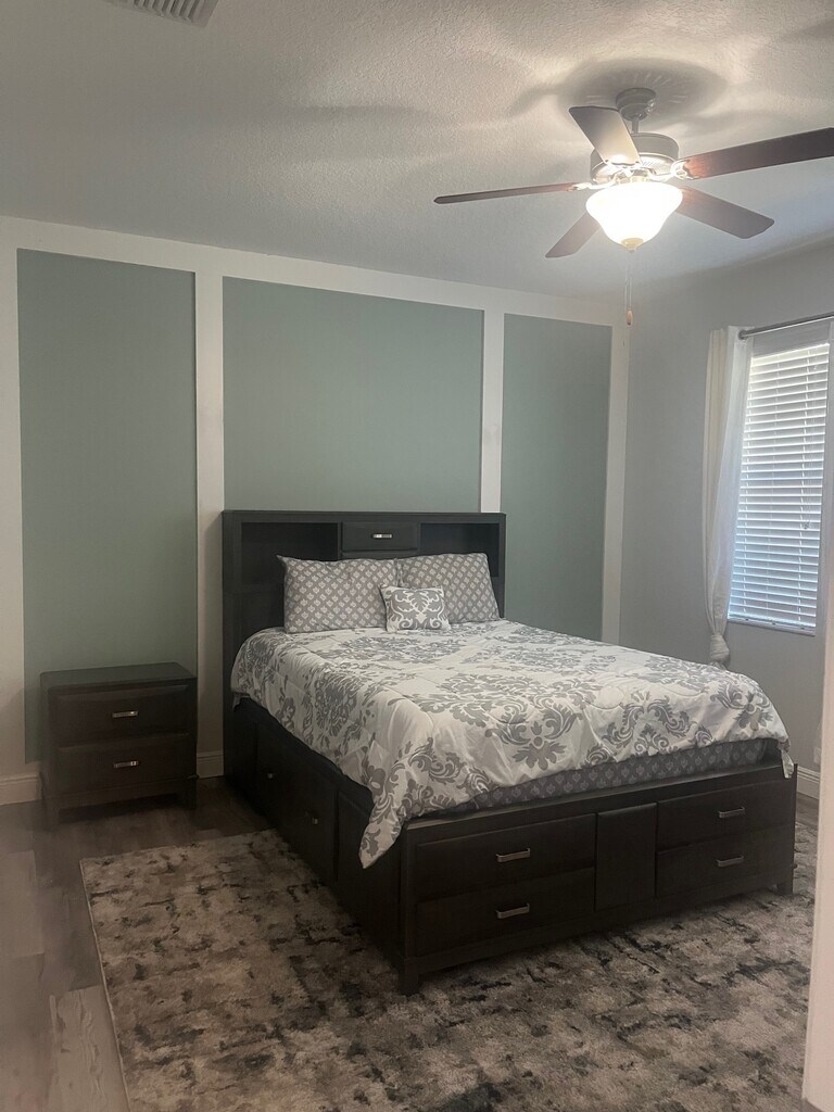 This 1-bedroom, 1-bathroom furnished room for rent at this newer 4/3.5 Townhouse in Apollo Beach / Riverview FL offers 2,130 square feet of living space. The bedroom features double vanities and ample storage, while the bathroom includes a shower combination. The shared living room provides a spacious area for relaxation and entertainment, enhanced by ceiling fans and heating for comfort. The property is equipped with high-speed internet access and Wi-Fi, making it suitable for remote work or streaming. A washer and dryer are included for added convenience. Common spaces will be shared with up to two other female professionals. The exterior offers a well-maintained environment, contributing to a pleasant living experience. The rental price is available upon request. The community also has multiple pools, courtyards and trails for recreational enjoyment.