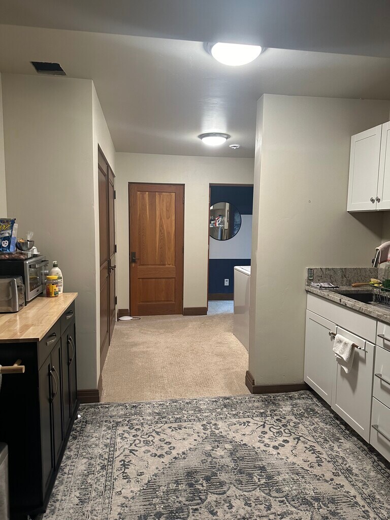 Location, location, location. Very close to the recreational center and two blocks from Main Street. This is a very well lit, very nicely done and large basement to our personal home. There is a private exterior entrance and a single dedicated parking spot. The kitchen does not have a full range, there is a cooktop, microwave and a large toaster oven. Full sized refrigerator. Please text me a little about yourself and your needs and we can determine if it is a good fit. I do require good credit/background, first, last and deposit ($2200) to move in.