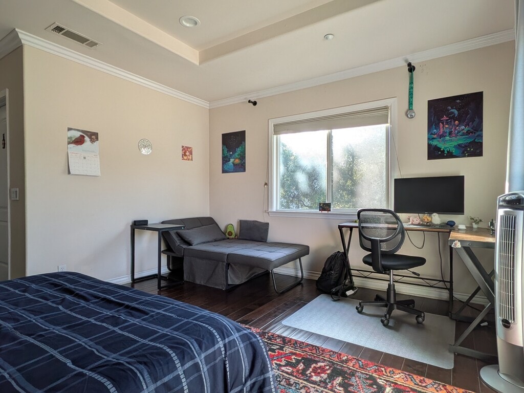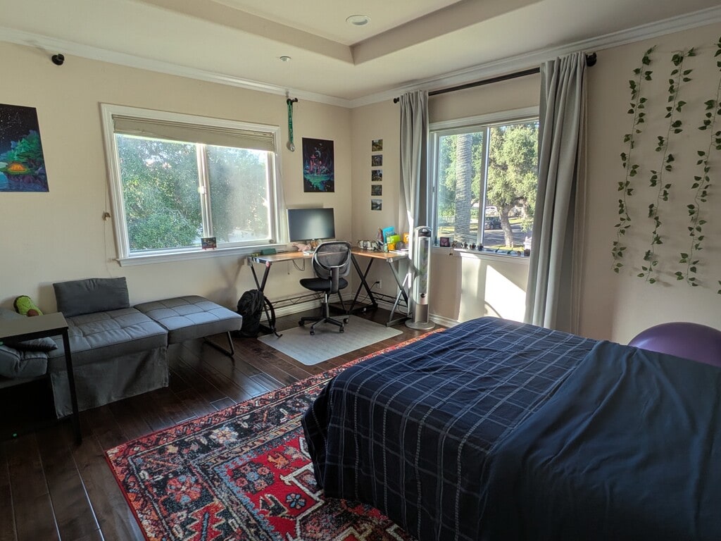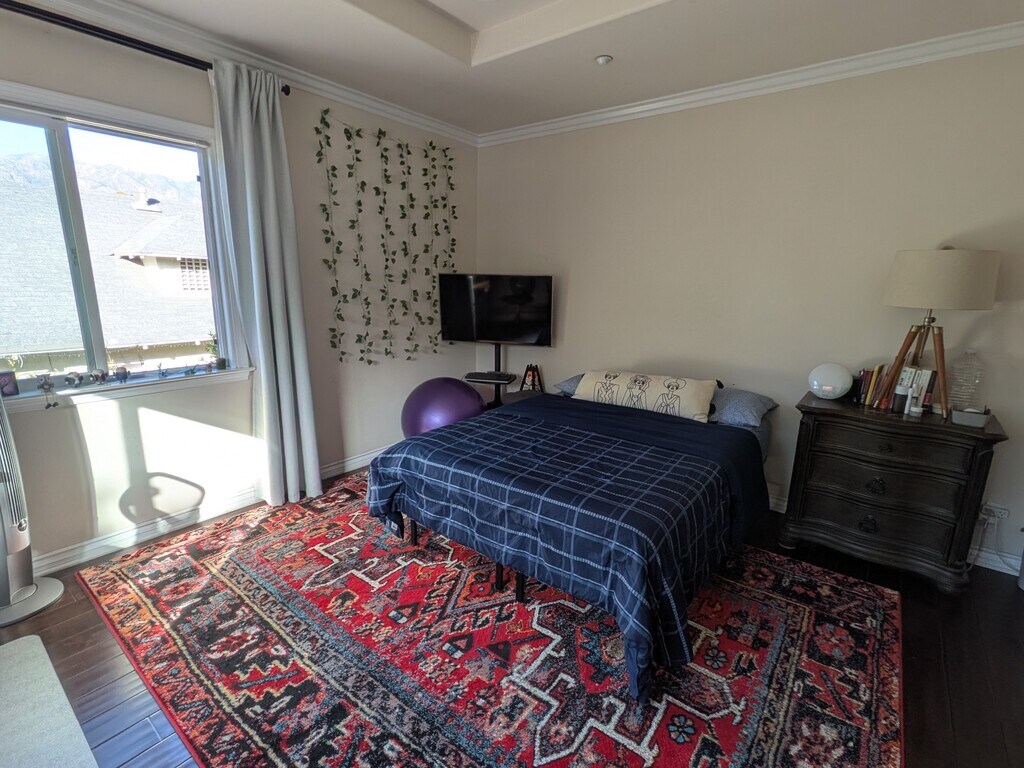 This is a private master bedroom with its own bathroom in a 5-bedroom Spanish-style house. The house is very new and in great conditions. It has central A/C. It is at a very convenient location, close to Colorado Blvd/S Hill Ave, within walking distance to Caltech and Pasadena City College. It is within 10min driving distance to theaters, gyms, Macy's, Whole Foods, Ralphs and many shops and restaurants in old town Pasadena. The room is furnished with a dresser, a desk and a queen-size mattress. It has a walk-in closet and a full bathroom with a jacuzzi. It has solid wood floor. There are two big windows in this room, making it very airy and bright. You can see the mountains from the room. You will be living with 4 other tenants who are professionals, very quiet and respectful. No smoking. No pets. The minimum lease is 12 months. Longer-term tenants are preferred. Utilities are not included and will be shared by all the tenants. Credit and background checks are required.
