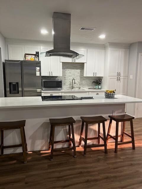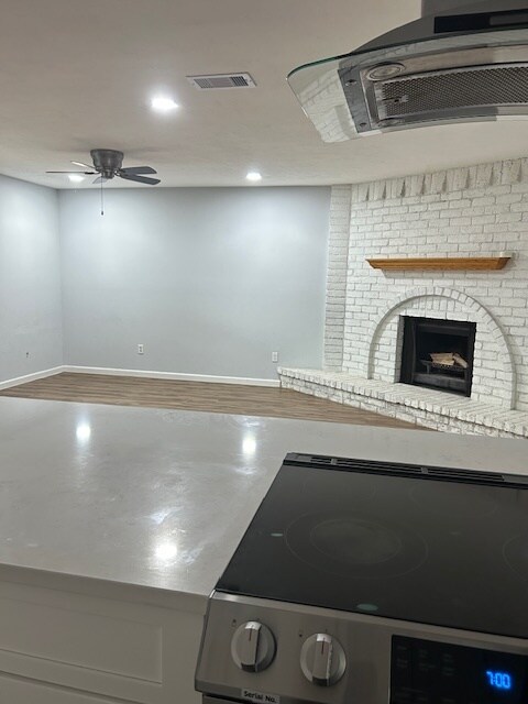 Charming 3 bedroom, 2 bath home with a modern kitchen featuring stainless steel appliances, quartz island countertops, washer/dryer hookups, and a back deck—great for relaxing or entertaining with a fireplace.