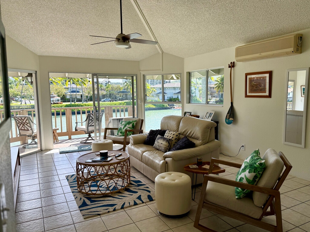 Welcome to your premium home away from home in an exclusive gated community. This rare top-floor (second-floor) end unit offers unmatched privacy and signature vaulted ceilings, providing an expansive, airy atmosphere tailored for the high-end working professional seeking peace for business travel, or a turnkey vacation in Honolulu. Experience the best of Honolulu's marina living with your own exclusive-use easement for a private boat dock. Residents enjoy easy ocean access for boating, paddling or other water activities. For added convenience, the unit provides direct access to the seawall via common stairs located between the buildings.