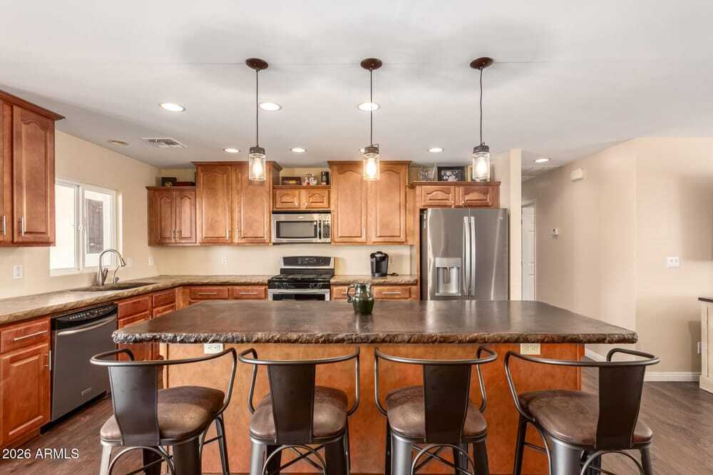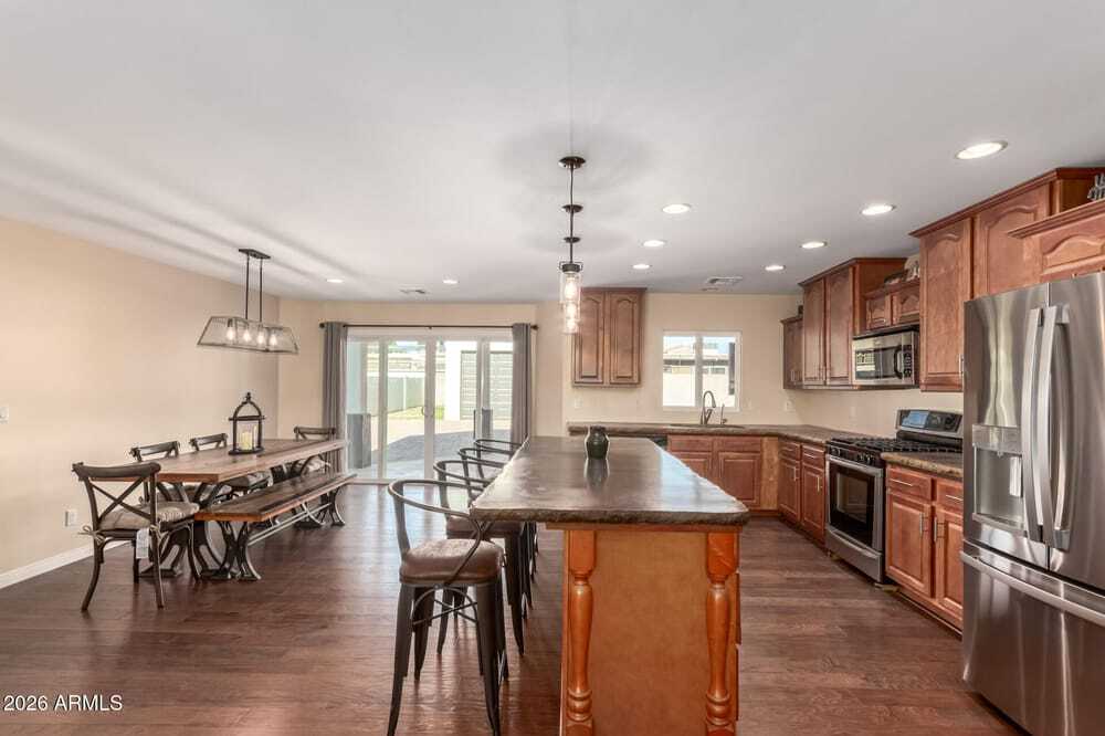 Stunning single-story home with no HOA! Great curb appeal, featuring a cozy front porch, RV gates & a paver driveway. Upon entry, you'll notice the warm and inviting vibe in every space, showcasing hardwood floors, abundant natural light, and two-tone paint. The impeccable kitchen boasts staggered cabinets adorned with crown molding, unique countertops, stainless steel appliances, and an island with a breakfast bar, perfect for entertaining. The main suite promises a good night's sleep and hosts a walk-in closet, a bathroom with dual sinks, and a private exit. Out back, you'll find a covered patio perfect for enjoying morning coffee, a grassy area, and a comfortable seating space with well-laid pavers. Hurry up, this gem won't last!
