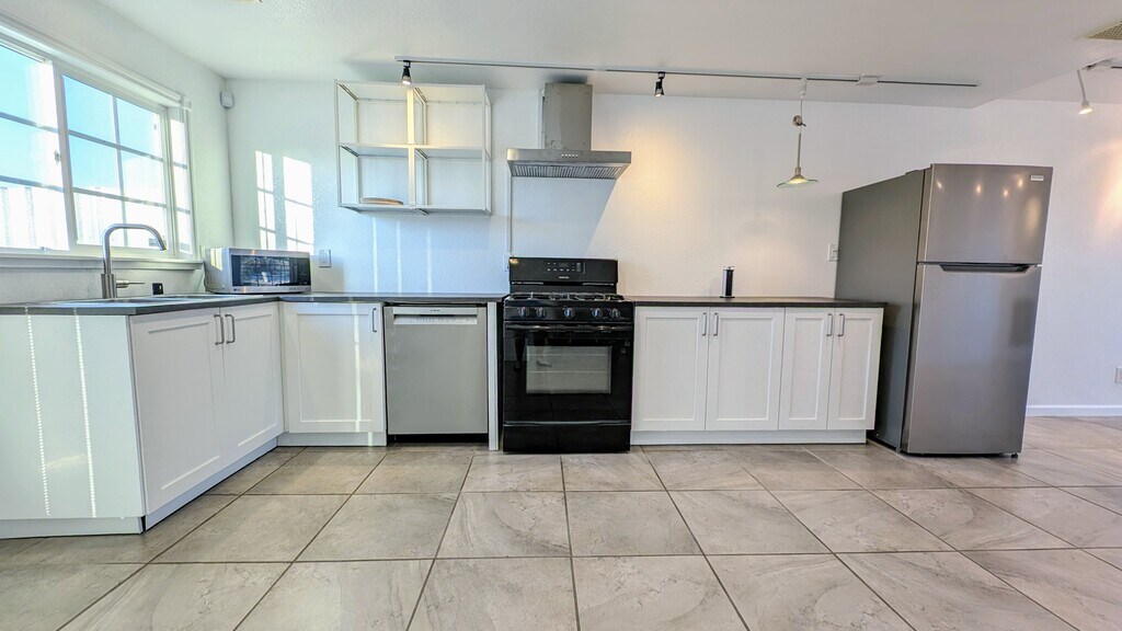 HUGE 1000 sq ft duplex apartment with bay window and wood burning fireplace, New stainless dishwasher, New stainless refrigerator, oven and recirculating hood. New washer, dryer, no carpet (tile throughout), New Split AC system, evaporative cooler also works great if you'd like to save utility costs! Brand new kitchen counters, cabinets and sink. Higher ceilings in the kitchen/living room. There is a second living room space which could make a second bedroom with the use of screens/a curtain. The main bedroom offers a unique rock wall, with a private bathroom that includes a corner shower with multiple jets. The property is equipped with ADT and ring security, new tankless hot water heater, EV charger. You will also benefit from the solar system on the roof, which covers much of the electricity use. Water, trash, gas and 300 mbps internet are included. The rear yard offers parking for 2 cars. You'll be on the west side of Twentynine Palms, walkable to Knott's sky park. A short drive to the Joshua Tree National Park Entrance, MCAGCC Base, and 20 minutes to Yucca Valley.