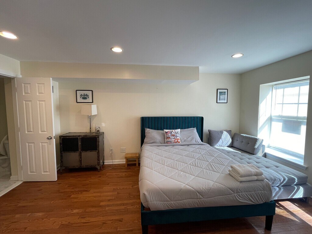 Bright and spacious basement apartment with a private entrance, large open living area, modern flooring, and recessed lighting. The unit features a functional kitchen with ample cabinet space, a full bathroom with clean updated finishes, and a practical layout for comfortable everyday living.