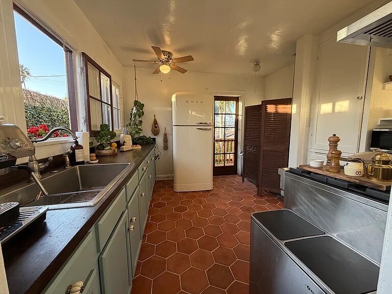 A rare find on the border of Venice and Marina del Rey this sun-filled upper-level 2-bedroom, 1-bathroom Spanish duplex blends vintage coastal charm with modern upgrades and lush outdoor living. Step inside to hardwood floors throughout, a renovated kitchen with terracotta tile, SMEG refrigerator, Viking range, and a brand-new LG ThinQ washer-dryer combo conveniently in-unit. 1 parking space in detached garage included! Both bedrooms feature large closets and walk-ins, with natural light pouring through windows framed by soaring palm trees. Enjoy central heating and a bright, airy layout filled with ocean breeze. Outside, relax in the spacious shared front and back yard surrounded by palms and a fruiting peach tree, with access to a hot tub, outdoor shower, and outdoor lounge and dining area perfect for unwinding or entertaining. Located less than a 10-minute walk to Venice Beach, and moments from Abbot Kinney, the Canals, and Erewhon, this home offers both serenity and proximity to the best of the Westside. Details 2 Bedrooms | 1 Bathroom Parking space in detached garage Upper unit in classic Spanish duplex Hardwood floors + new terracotta kitchen tile Unfurnished Central heating In-unit LG ThinQ washer/dryer combo Shared yard, hot tub & outdoor amenities Pets considered Available December 1 Minimum 1-year lease Lease Terms 12-month lease minimum Tenant pays: electricity & gas Water & sewer billed by ll upon receipt No smoking or vaping Renters insurance required (minimum $100K liability) 2-pet maximum ll approval required Shared yard with hot tub, outdoor shower & lounge area