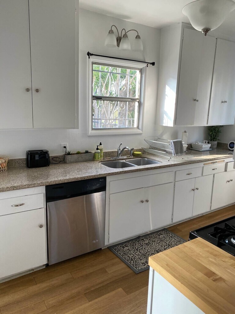 LOCATION, LOCATION, LOCATION! This cottage-style house is steps away from bustling Melrose with its many restaurants, shops, clubs, bars and coffee spots. Walk to Trader Joe's, a big park, public transportation, and Santa Monica Bl. The house features a living room, formal dining room, and 2 bedrooms- all with original hardwood floors, bathroom with original vintage tile, kitchen with stainless steel appliances, and laundry room with stack washer and dryer. The fully enclosed backyard is huge (7,000 sf) with large grassy areas and ample, secure drieway parking. Central air and heat. Weekly gardening serices are included.