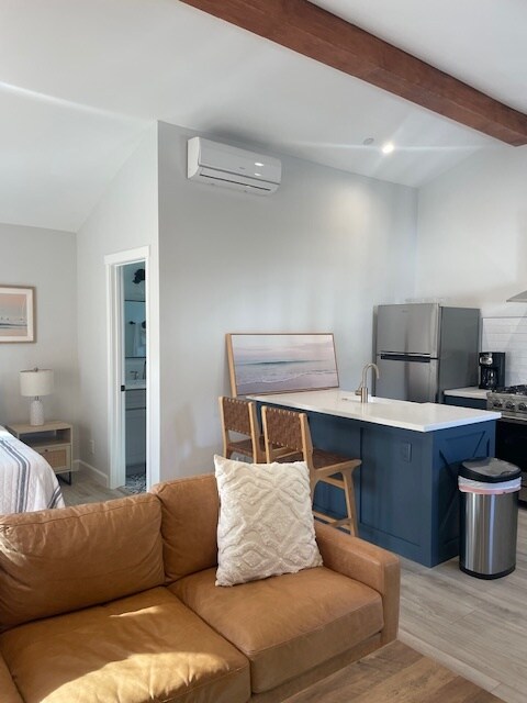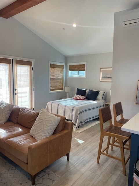 PRIVATE, QUIET, BRIGHT, CLEAN Updated FURNISHED Studio Above Detached Garage Tree Section, Walk to Beach and North Manhattan Wood Floors Stainless Steel Appliances Counter with Bar Stools Leather Couch, Smart TV, Full Size Bed Sheets/Towels Included Private Entry Balcony Street Parking ONLY Owner Pays ALL Utilities, WIFI Included Dedicated Laundry for Studio A/C In Unit No Pets 30 Day Minimum Stay