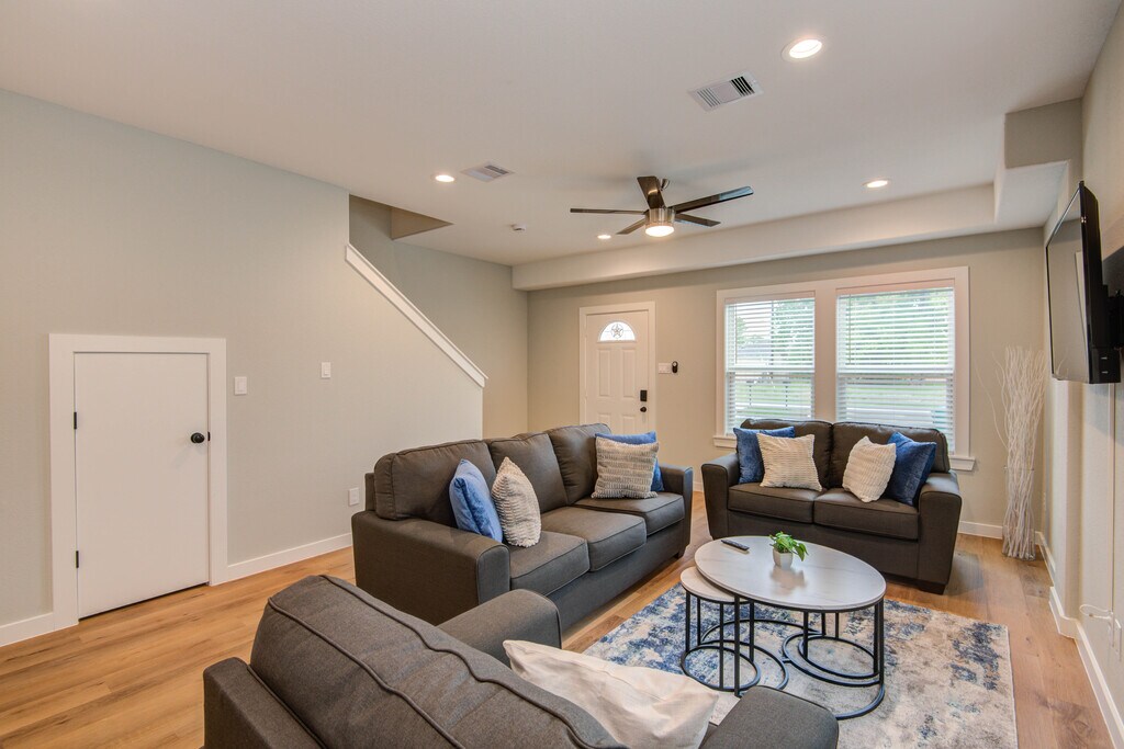 Dúplex de construcción completamente amueblado, se permiten mascotas. 3 dormitorios y 2,5 baños. Este hotel cuenta con un patio trasero completamente cercado, con estacionamiento en el camino de acceso, y está cerca de las principales autopistas. En la lavadora y secadora de la unidad, con televisores inteligentes en todas las habitaciones. A sólo 20 minutos del centro de Houston y de los aeropuertos IAH y Hobby. Arrendamientos a corto/medio plazo disponibles. Todas las utilidades se incluyen con un límite. Se permiten mascotas con cargo. Absolutamente no fumar dentro de la propiedad. Se requiere proceso de solicitud y verificación de antecedentes.