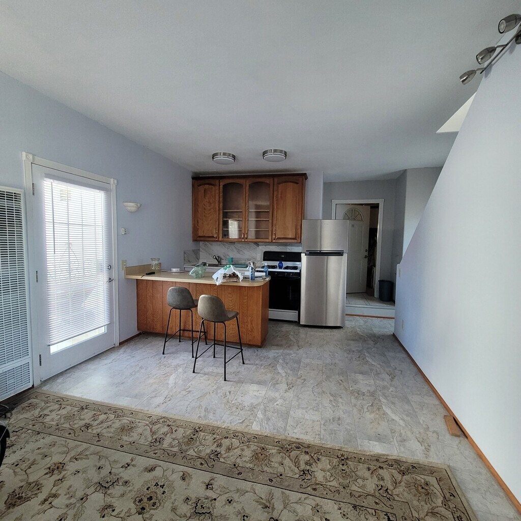 New paint, flooring, cabinets, Refrig, bath cabinet and fixtures, walk in closet, nice breeze in upstairs. Private outside patio in 6 ft fenced yard. Large closet under stairs. Easy going Owners in other half of house, desires chill out renter.