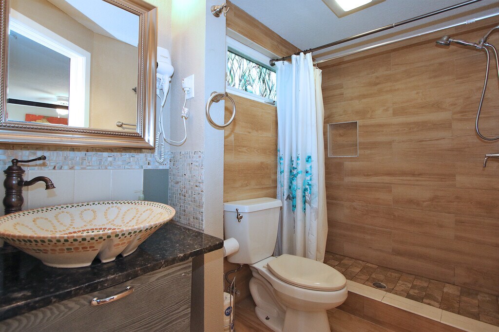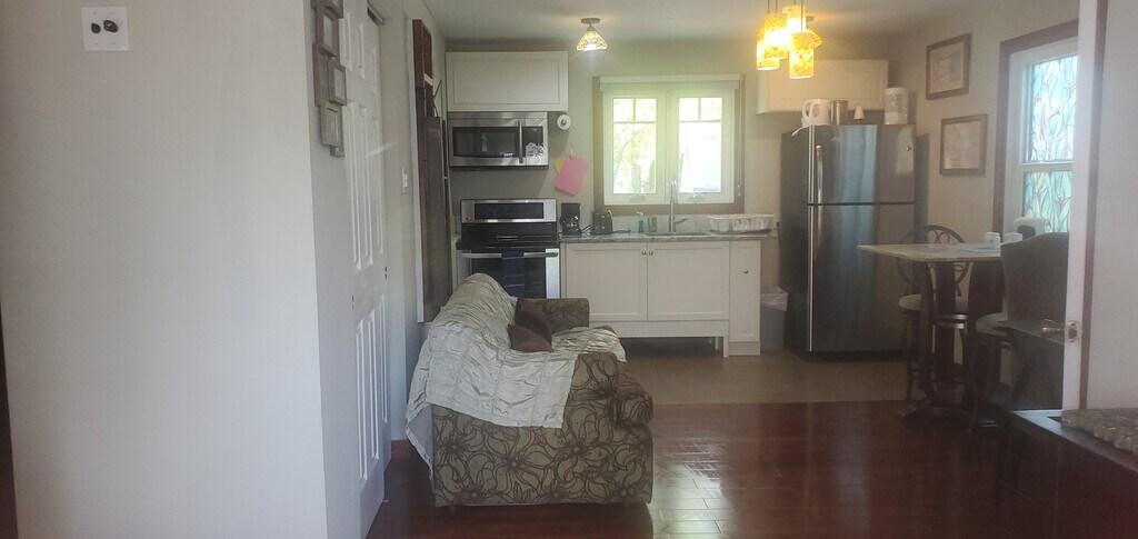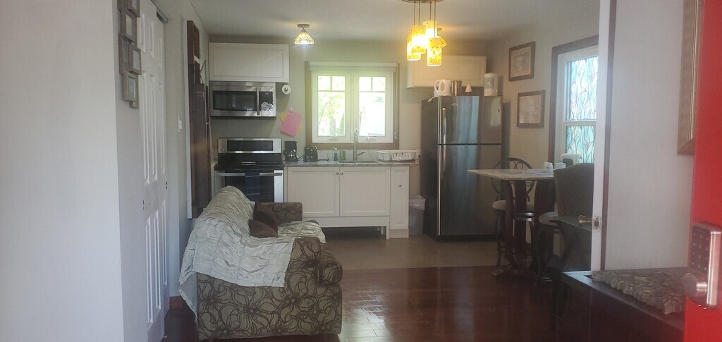 Apartment is spacious & comfortable, completely renovated. A great place to work or relax and unwind. Suite is located in Hollywood and is fully equipped. Queen size bed, couch, dining area including table, bathroom with shower. Dedicated a/c, Wi-Fi & cable TV. It is equipped with a kitchen for cooking including full size refrigerator, range and oven, toaster oven, and coffee maker. Parking & coin laundry are both available onsite. Access to shared outside seating area.