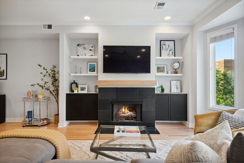 Stunning turn key Wide Layout condo in River West. Kitchen boasts high-end renovation with quartz countertops, stainless steel appliances, large Absolutely meticulous and highly updated turn-key 2 bedroom 2 bathroom condo in River West. As you enter, you are immediately in awe of the expansive, wide layout with newly stained and refinished natural oak floors spanning the entire unit. Tons of natural light floods into the unit due to the large bay windows and a Juliet balcony off the living room. Gas Fireplace tiling & mantle newly updated with floating shelves and cabinetry entertainment wall creating a really cool aesthetic sure to impress. The kitchen boasts a modern day high end renovation with white quartz countertops, stainless steel appliances, large stainless farm house sink, 42 inch light grey painted cabinetry and subway tile backsplash. Large peninsula opens up to the amazing living/dining room combo and allows for 2-3 barstools. Living room also features plenty of room for a WFH desk setup. As you work your way down the hallway and towards the rear of the unit, your primary suite has private balcony with city views, large walk-in closet and spacious ensuite bath with double vanity, standing shower with glass enclosure and a spa style soaking tub. Second bedroom is a great size, allowing for versatility. Unit also features a full second bathroom, full size LG stackable washer & dryer, updated lighting and fans and much more. Gated, secure & covered parking space included in the rent. Perfectly positioned steps to the blue line on quiet residential street with easy access to River North, West Loop, Old Town & Fulton Market. Don't forget about being across the street from the AIRE ancient bathhouse to wind down and relax after a long week. $750 move in fee. No dogs. * Squarefootage listed is not exact.