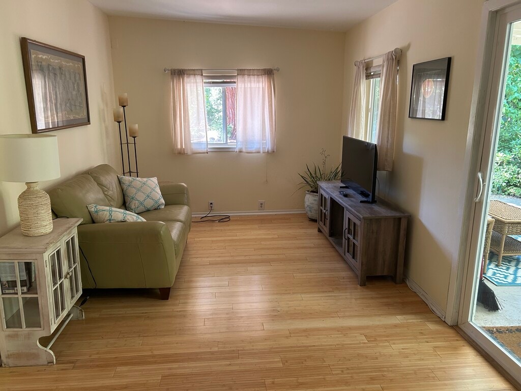 Charming cottage with one bedroom and one office room is at the end of a private lane which open up to Ragle Ranch, a 150 acre Sonoma County Park. Quiet, peaceful. light and airy. This beautiful property has lots of gardens. fruit trees, and even a few redwoods. Fully furnished (also available unfurnished). A country feel but a short walk to town