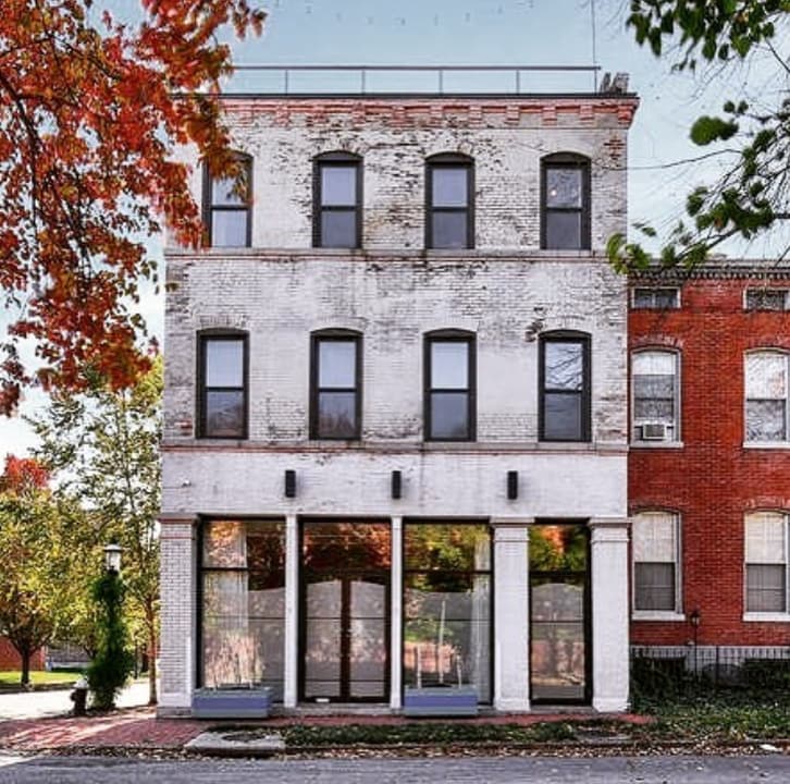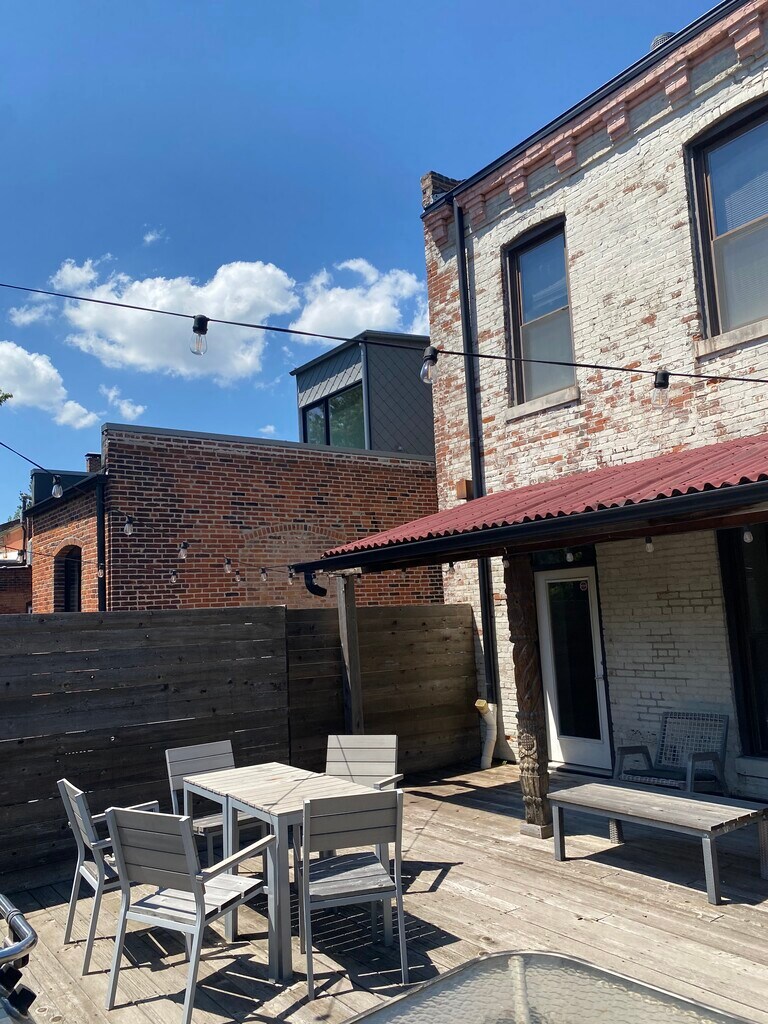 Skyline View of Downtown St Louis. Quiet dead end street in Historic Frenchtown of downtown St Louis with homes dating back to 1840. This high ceiling 3 story condo has 3 large bedrooms and a 4th loft space. Fully furnished with 3 queen beds and one king bed. Family room with huge leather couch and 60" Ultra HD Flatscreen. Keypad private entry. Two decks with views every way of downtown. Two car garage parking for an extra monthly fee.