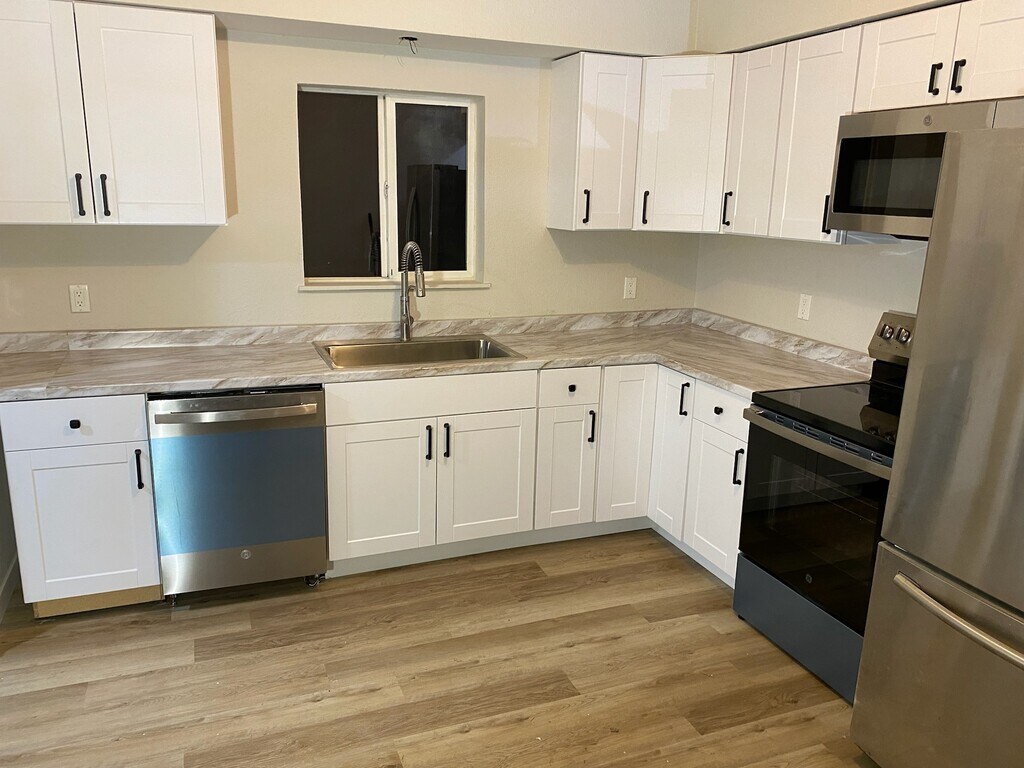 This recently renovated three-bedroom, two-bathroom residence features an expansive yard and a compact storage shed.